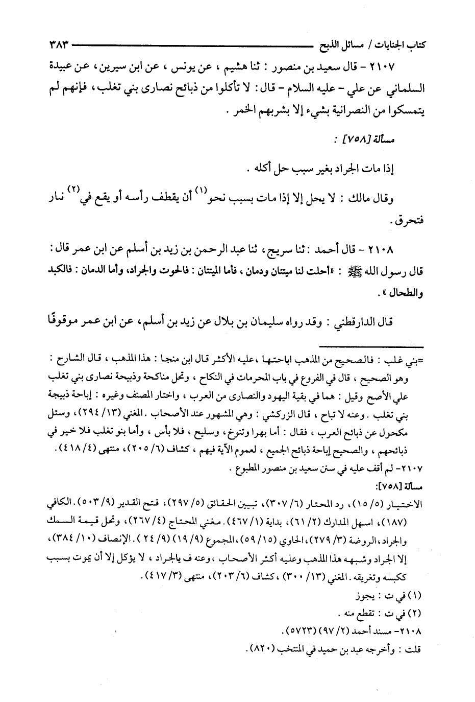 2107 - قال سعيد بن منصور : ثنا هشيم ، عن يونس ، عن ابن سيرين ، عن عبيدة السلماني عن علي - عليه السلام - قال : لا تأكلوا من ذبائح نصارى بني تغلب ، فإنهم لم يتمسكوا من النصرانية بشيء إلا بشربهم الخمر .