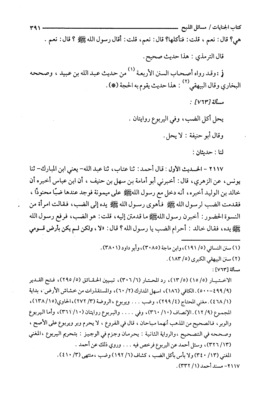 2117 - الحديث الأول : قال أحمد : ثنا عتاب ، ثنا عبد الله - يعني ابن المبارك - ثنا يونس ، عن الزهري ، قال : أخبرني أبو أمامة بن سهل بن حنيف ، أن ابن عباس أخبره أن خالد بن الوليد أخبره ، أنه دخل مع رسول الله على ميمونه فوجد عندها ضبا محنوذا ، فقدمت الضب لرسول الله فأهوى رسول الله يده إلى الضب ، فقالت امرأه من النسوه الحضور : أخبرن رسول الله ما قدمتن إليه ، قلت : هو الضب ، فرفع رسول الله يده ، فقال خالد : أحرام الضب يا رسول الله ؟ قال : ' لا ، ولكن لم يكن بأرض قومي