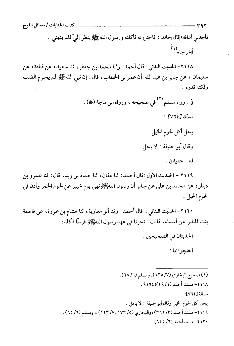 2119 - الحديث الأول : قال أحمد : ثنا عفان ، ثنا حماد بن زيد ، قال : ثنا عمرو بن دينار ، عن محمد بن علي عن جابر أن رسول الله نهى يوم خيبر عن لحوم الحمر و أذن في لحوم الخيل .