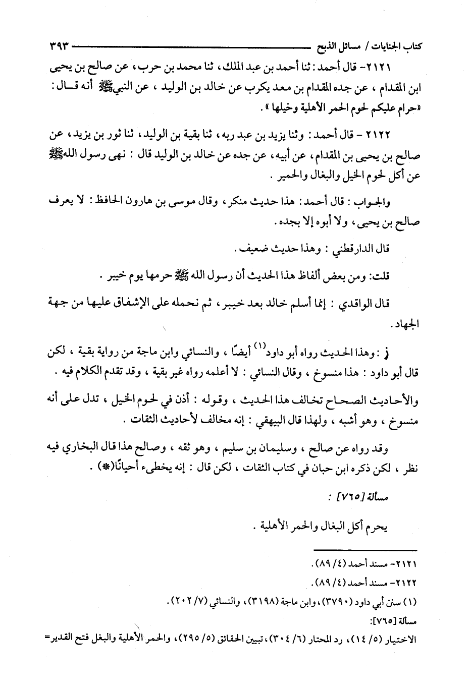 2122 - قال أحمد : وثنا يزيد بن عبد ربه ، ثنا بقية بن الوليد ، ثنا ثور بن يزيد ، عن صالح بن يحيى بن المقدام ، عن أبيه ، عن جده عن خالد بن الوليد قال : نهى رسول الله عن أكل لحوم الخيل و البغال و الحمير .
