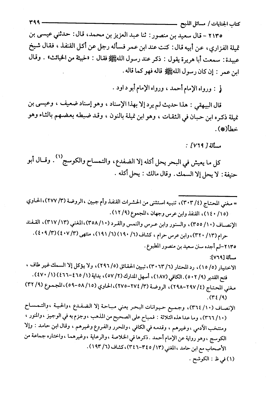 2135 - قال سعيد بن منصور : ثنا عبد العزيز بن محمد ، قال : حدثني عيسى بن تميلة الفزاري ، عن أبيه قال : كنت عند ابن عمر فسأله رجل عن أكل القنفذ ، فقال شيخ عبيدة : سمعت أبا هريرة يقول : ذكر عند رسول الله فقال : ' خبيثة من الخبائث ' . وقال ابن عمر : إن كان رسول الله قاله فهو كما قاله .