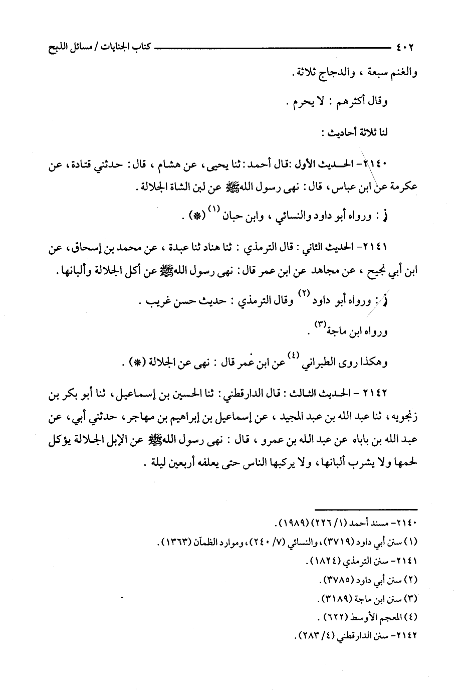 2140 - الحديث الأول : قال أحمد : ثنا يحيى ، عن هشام ، قال : حدثني قتادة ، عن عكرمة عن ابن عباس ، قال : نهى رسول الله عن لبن الشاة الجلالة .