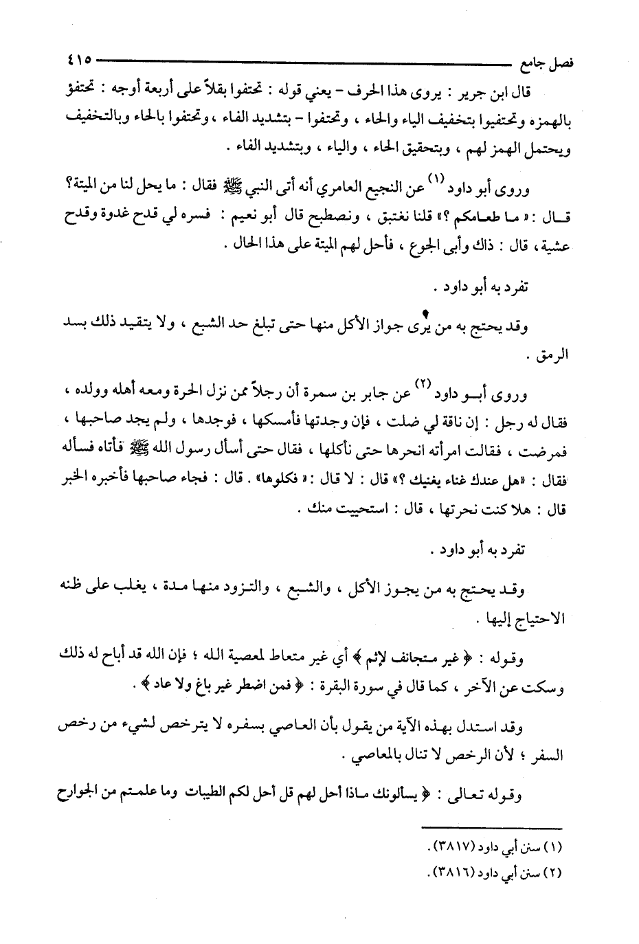 وروى أبو داود ( 1 ) عن النجيع العامري أنه أتى النبي فقال : ما يحل لنا من الميتة ؟ قال : ' ماطعامكم ؟ ' قلنا نغتبق ، ونصطبح قال أبو نعيم : فسره لي قدح غدوة وقدح عشية ، قال : ذاك وأبي الجوع ، فأحل لهم الميتة على هذا الحال .