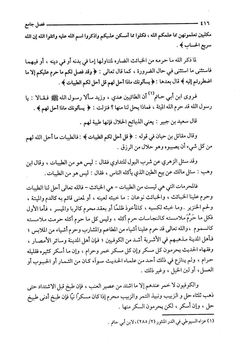 فالمحرمات التي هي ليست من الطيبات - هي الخبائث - فالله تعالى أحل لنا الطيبات وحرم علينا الخبائث ، والخبائث نوعان : ما خبثه لعينه ، أو لمعنى قائم به كالدم والميتة ، ولحم الخنزير . وما خبثه لكسبه ، كالمأخوذ ظلماً أو بعقد محرم كالربا والميسر ، فأما الأول فكل ما حَرُمَ ملامسته كالنجاسات حرم أكله ، وليس كل ما حرم أكله حرمت ملامسته كالسموم ، والله تعالى قد حرم علينا أشياء من المطاعم والمشارب وحرم أشياء من الملابس ؛ فأهل المدينة مذهبهم في الأشربة أشد من الكوفيين ؛ فإن أهل المدينة وسائر الأمصار ، وفقهاء الحديث يحرمون كل مسكر وإن كل مسكر خمر وحرام ، وإن ما أسكر كثيره فقليله حرام ، ولم ينازع في ذلك أحد من علماء الحديث سواء كان من الثمار أو الحبوب أو العسل ، أو لبن الخيل ، وغير ذلك .