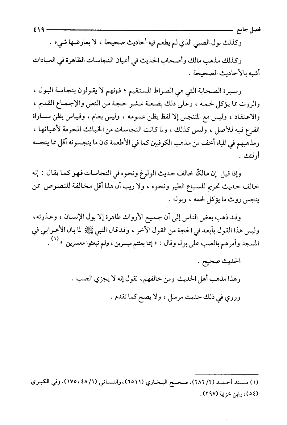 وسيرة الصحابة التي هي الصراط المستقيم ؛ فإنهم لا يقولون بنجاسة البول ، والروث مما يؤكل لحمه ، وعلى ذلك بضعة عشر حجة من النص والإجماع القديم ، والاعتقاد ، وليس مع المتنجس إلا لفظ يظن عمومه ، وليس بعام ، وقياس يظن مساواة الفرع فيه للأصل ، وليس كذلك ، ولما كانت النجاسات من الخبائث المحرمة لأعيانها ، ومذهبهم في المياه أخف من مذهب الكوفيين كما في الأطعمة كان ما ينجسونه أقل مما ينجسه أولئك .