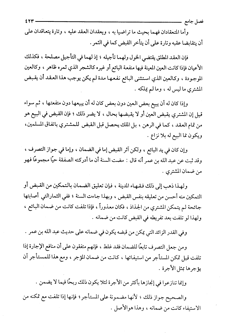 فإن العقد المطلق يقتضي الخول ولهما تأجيله ؛ إذ لهما في التأجيل مصلحة ، فكذلك الأعيان فإذا كانت العين المعينة فيها منفعة البائع أو غيره كالشجر الذي ثمره ظاهر ، وكالعين الموجودة ، وكالعين الذي استثنى البائع نفعها مدة لم يكن يوجب هذا العقد أن يقبض المشتري ما ليس له ، وما لم يملكه .