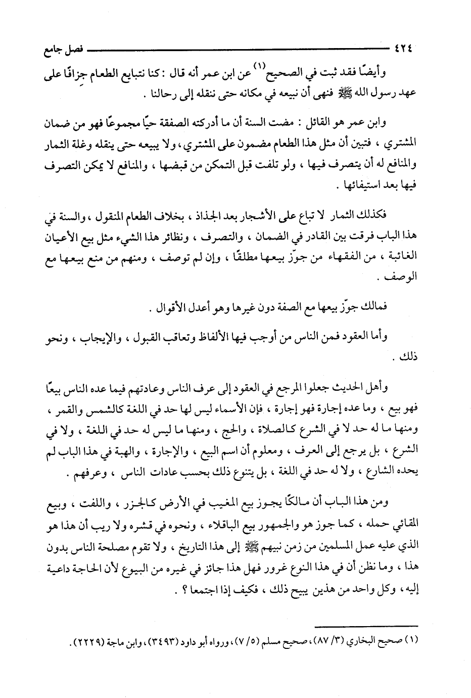 وابن عمر هو القائل : مضت السنة أن ما أدركته الصفقة حياً مجموعاً فهو من ضمان المشتري ، فتبين أن مثل هذا الطعام مضمون على المشتري ، ولا يبيعه حتى ينقله وغلة الثمار والمنافع له أن يتصرف فيها ، ولو تلفت قبل التمكن من قبضها ، والمنافع لا يمكن التصرف فيها بعد استيفائها .