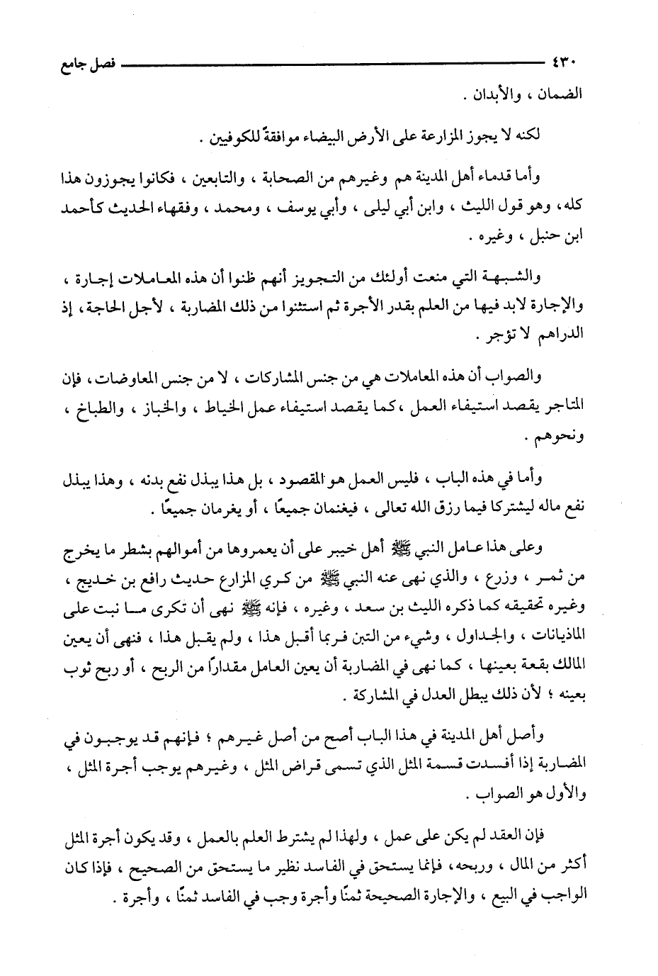 وعلى هذا عامل النبي أهل خيبر على أن يعمروها من أموالهم بشطر ما يخرج من ثمر ، وزرع ، والذي نهى عنه النبي من كري المزارع حديث رافع بن خديج ، وغيره تحقيقه كما ذكره الليث بن سعد ، وغيره ، فإنه نهى أن تكرى ما نبت على الماذيانات ، والجداول ، وشيء من التبن فربما أقبل هذا ، ولم يقبل هذا ، فنهى أن يعين المالك بقعة بعينها ، كما نهى في المضاربة أن يعين العامل مقداراً من الربح ، أو ربح ثوب بعينه ؛ لأن ذلك يبطل العدل في المشاركة .