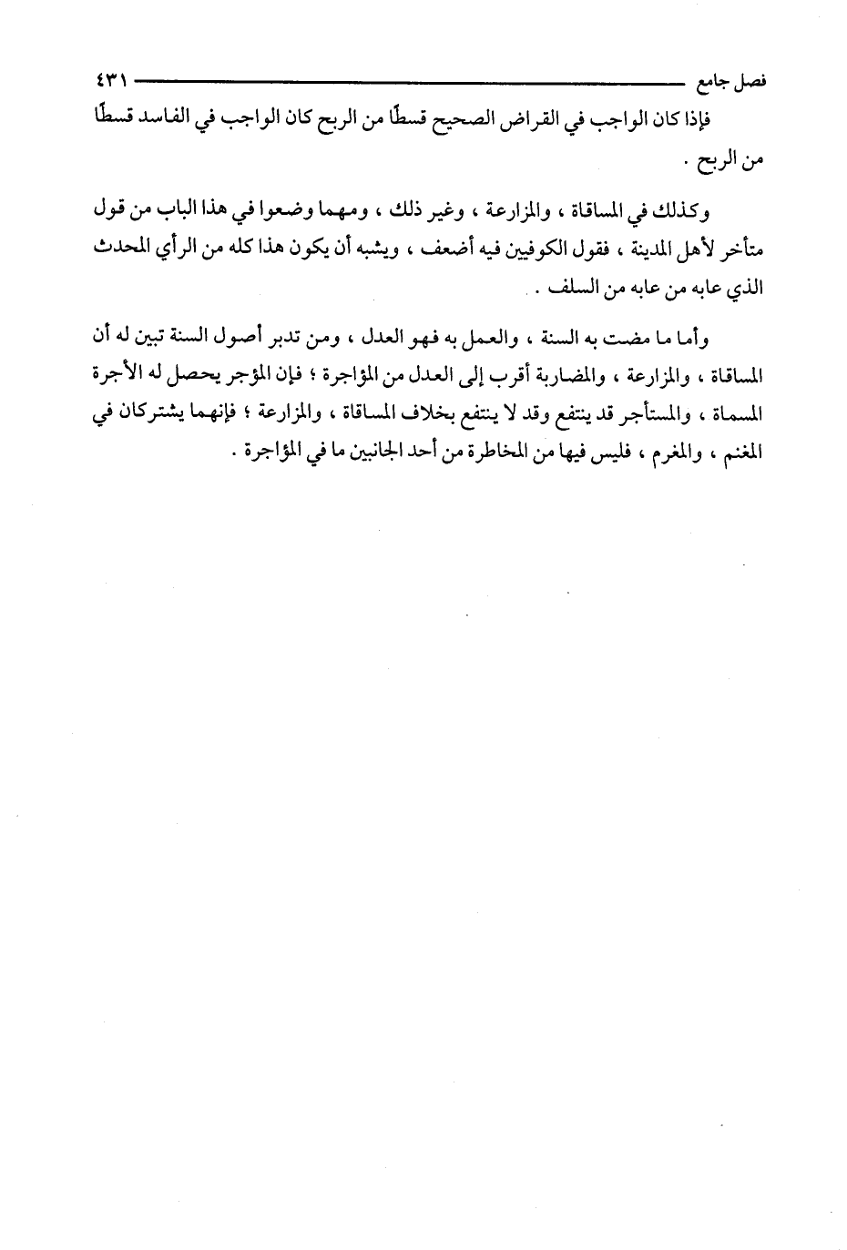 وأما ما مضت به السنة ، والعمل به فهو العدل ، ومن تدبر أصول السنة تبين له أن المساقاة ، والمزارعة ، والمضاربة أقرب إلى العدل من المؤاجرة ؛ فإن المؤجر يحصل له الأجرة المسماة ، والمستأجر قد ينتفع وقد لا ينتفع بخلاف المساقاة ، والمزارعة ؛ فإنهما يشتركان في المغنم ، والمغرم ، فليس فيها من المخاطرة من أحد الجانبين ما في المؤاجرة .