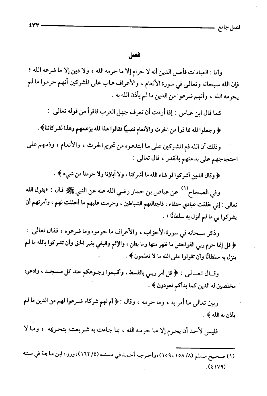 وفي الصحاح ( 1 ) عن عياض بن حمار رضي الله عنه عن النبي قال : ' يقول الله تعالى : ( ^ إني خلقت عبادي حنفاء ، فاجتالتهم الشياطين ، وحرمت عليهم ما أحللت لهم ، وأمرتهم أن يشركوا بي ما لم أنزل به سلطاناً ' .