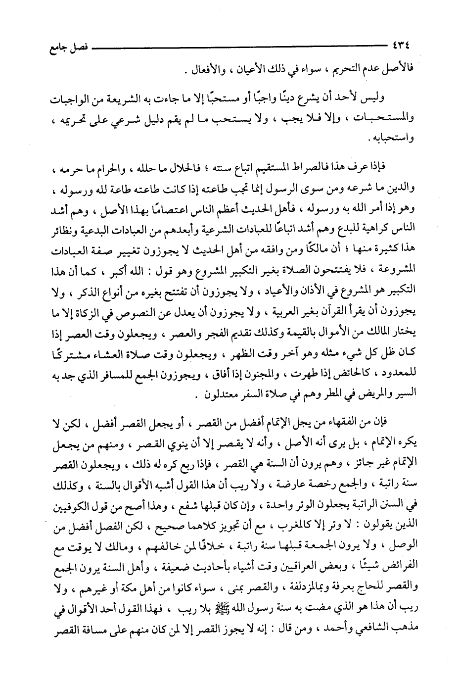 فإذا عرف هذا فالصراط المستقيم اتباع سنته ؛ فالحلال ما حلله ، والحرام ما حرمه ، والدين ما شرعه ومن سوى الرسول إنما تجب طاعته إذا كانت طاعته طاعة لله ورسوله ، وهو إذا أمر الله به ورسوله ، فأهل الحديث أعظم الناس اعتصاماً بهذا الأصل ، وهم أشد الناس كراهية للبدع وهم أشد اتباعاً للعبادات الشرعية وأبعدهم من العبادات البدعية ونظائر هذا كثيرة منها ؛ أن مالكاً ومن وافقه من أهل الحديث لا يجوزون تغيير صفة العبادات المشروعة ، فلا يفتتحون الصلاة بغير التكبير المشروع وهو قول : الله أكبر ، كما أن هذا التكبير هو المشروع في الأذان والأعياد ، ولا يجوزون أن تفتتح بغيره من أنواع الذكر ، ولا يجوزون أن يقرأ القرآن بغير العربية ، ولا يعدل عن النصوص في الزكاة إلا ما يختار المالك من الأموال بالقيمة وكذلك تقديم الفجر والعصر ، ويجعلون وقت العصر إذا كان ظل كل شيء مثله وهو آخر وقت الظهر ، ويجعلون وقت صلاة العشاء مشتركاً للمعدود ، كالحائض إذا طهرت ، والمجنون إذا أفاق ، ويجوزون الجمع للمسافر الذي جد به السير والمريض في المطر وهم في صلاة السفر معتدلون .
