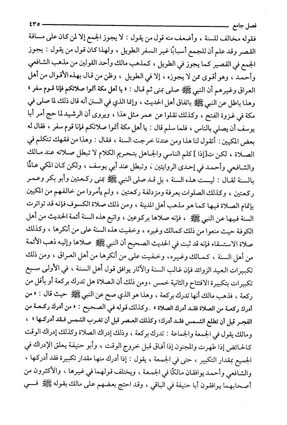 فقوله مخالف للسنة ، وأضعف منه قول من يقول : لا يجوز الجمع إلا لمن كان على مسافة القصر وقد علم أن للجمع أسباباً غير السفر الطويل ، ولهذا كان قول من يقول : يجوز الجمع في القصير كما يجوز في الطويل ، كمذهب مالك وأحد القولين من مذهب الشافعي وأحمد ، وهو أقوى ممن لا يجوزه ، إلا في الطويل ، وظن من قال بهذه الأقوال من أهل العراق وغيرهم أن النبي صلى بمنى ثم قال : ' يا أهل مكة أتموا صلاتكم فإنا قوم سفر ' وهذا باطل عن النبي باتفاق أهل الحديث ، وإنما الذي في السنن أنه قال ذلك لما صلى في مكة في غزوة الفتح ، وكذلك نقلوا عن عمر مثل هذا ، ويروى أن الرشيد لما حج أمر أبا يوسف أن يصلي بالناس ، فلما سلم قال : يا أهل مكة أتموا صلاتكم فإنا قوم سفر ، فقال له بعض المكيين : أتقول لنا هذا ومن عندنا خرجت السنة ، فقال : وهذا من فقهك تتكلم في الصلاة ، لكنت [ إذا ] كلم الناسي والجاهل بتحريم الكلام لا تبطل صلاته عند مالك والشافعي وأحمد في إحدى الروايتين ، وتبطل عند أبي يوسف ، ولكن كان المكي عالماً بالسنة لقال : ليست هذه السنة ، بل قد صلى النبي بمنى ركعتين وأبو بكر وعمر ركعتين ، وكذلك الصلوات بعرفة ومزدلفة ركعتين ، ولم يأمروا من خالفهم من المكيين بإتمام الصلاة فيها كما هو مذهب أهل المدينة ، ومن ذلك صلاة الكسوف فإنه قد تواترت السنة فيها عن النبي ، فإنه صلاها بركوعين ، واتبع هذه السنة أئمة الحديث من أهل الكوفة حيث منعوا من ذلك كمالك وغيره ، وخفيت هذه السنة على من أنكرها ، وكذلك صلاة الاستسقاء فإنه قد ثبت في الحديث الصحيح أن النبي صلاها وإليه ذهب الأئمة من أهل السنة ، كمالك وغيره ، وخفيت على من أنكرها من أهل العراق ، ومن ذلك تكبيرات العيد الزوائد فإن غالب السنة والآثار يوافق قول أهل السنة ، في الأولى سبع تكبيرات بتكبيرة الافتتاح والثانية خمس ، ومن ذلك أن الصلاة هل تدرك بركعة أو بأقل من ركعة ، فذهب مالك أنها تدرك بركعة ، وهذا هو الذي صح عن النبي حيث قال : ' من أدرك ركعة من الصلاة فقد أدرك الصلاة ' . وكذلك قوله في الصحيح : ' من أدرك ركعة من الفجر قبل أن تطلع الشمس فقد أدرك ؛ وكذلك العصر قبل أن تغرب الشمس فقد أدركها ' ، ومالك يقول في الجمعة والجماعة : تدرك بركعة ، وذلك إدراك الصلاة وكذلك إدراك الوقت كالحائض إذا طهرت والمجنون إذا أفاق قبل خروج الوقت ، وأبو حنيفة يعلق الإدراك في الجميع بمقدار التكبير ، حتى في الجمعة ، يقول : إذا أدرك منها مقدار تكبيرة فقد أدركها ، والشافعي وأحمد يوافقان مالكاً في الجمعة ، ويختلف قولهما في غيرها ، والأكثرون من أصحابهما يوافقون أبا حنيفة في الباقي ، وقد احتج بعضهم على مالك بقوله في
