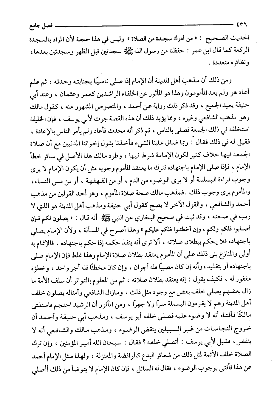 ومن ذلك أن مذهب أهل المدينة أن الإمام إذا صلى ناسياً بجنابته وحدثه ، ثم علم أعاد هو ولم يعد المأمون وهذا هو المأثور عن الخلفاء الراشدين كعمر وعثمان ، وعند أبي حنيفة يعيد الجميع ، وقد ذكر ذلك رواية عن أحمد ، والمنصوص المشهور عنه ، كقول مالك وهو مذهب الشافعي وغيره ، ومما يؤيد ذلك أن هذه القصة جرت لأبي يوسف ، فإن الخليفة استخلفه في ذلك الجمعة فصلى بالناس ، ثم ذكر أنه محدث فأعاد ولم يأمر الناس بالإعادة ، فقيل له في ذلك فقال : ربما ضاق علينا الشيء فأخذنا بقول إخواننا المدنيين مع أن صلاة الجمعة فيها خلاف كثير لكون الإمامة شرط فيها ، وطرد مالك هذا الأصل في سائر خطأ الإمام ، فإذا صلى الإمام باجتهاده فترك ما يعتقد المأموم وجوبه مثل أن يكون الإمام لا يرى وجوب قراءة البسملة أو لا يرى الوضوء من الدم ، أو من القهقهة ، أو من مس النساء ، والمأموم يرى وجوب ذلك . فمذهب مالك صحة صلاة المأموم ، وهو أحد القولين من مذهب أحمد والشافعي ، والقول الآخر لا يصح كقول أبي حنيفة ومذهب أهل المدينة هو الذي لا ريب في صحته ، وقد ثبت في صحيح البخاري عن النبي أنه قال : ' يصلون لكم فإن أصابوا فلكم ولكم ، وإن أخطئوا فلكم عليكم ' وهذا أصرح في المسألة ، ولأن الإمام يصلي باجتهاده فلا يحكم ببطلان صلاته ، ألا ترى أنه ينفذ حكمه إذا حكم باجتهاده ، فالإتمام به أولى والمنازع بنى ذلك على أن المأموم يعتقد بطلان صلاة الإمام وهذا غلط فإن الإمام صلى باجتهاده أو بتقليد ، وأنه إن كان مصيباً فله أجران ، وإن كان مخطئاً فله أجر واحد ، وخطؤه مغفور له ، فكيف يقول : إنه يعتقد بطلان صلاته ، ثم من المعلوم بالتواتر أن سلف الأمة ما زال بعضهم يصلي خلف بعض مع وجود مثل ذلك ، وما زال الشافعي وأمثاله يصلون خلف أهل المدينة وهم يقرءون البسملة سراً ولا جهراً ، ومن المأثور أن الرشيد احتجم فاستفتى مالكاً فأفتاه أنه لا وضوء عليه فصلى خلفه أبو يوسف ، ومذهب أبي حنيفة وأحمد أن خروج النجاسات من غير السبيلين ينقض الوضوء ، ومذهب مالك والشافعي أنه لا ينقص ، فقيل لأبي يوسف : أتصلي خلفه ؟ فقال : سبحان الله أمير المؤمنين ، وإن ترك الصلاة خلف الأئمة لمثل ذلك من شعائر البدع كالرافضة والمعتزلة ، ولهذا سئل الإمام أحمد عن هذا فأفتى بوجوب الوضوء ، فقال له السائل ، فإن كان الإمام لا يتوضأ من ذلك أأصلي