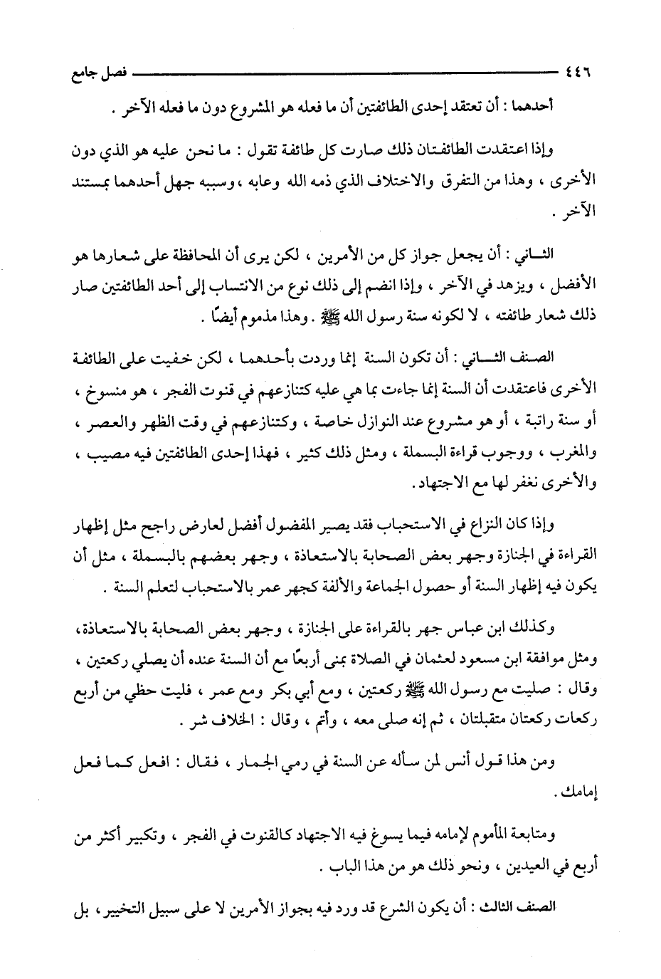 الصنف الثاني : أن تكون السنة إنما وردت بأحدهما ، لكن خفيت على الطائفة الأخرى فاعتقدت أن السنة إنما جاءت بما هي عليه كتنازعهم في قنوت الفجر ، هو منسوخ ، أو سنة راتبة ، أو هو مشروع عند النوازل خاصة ، وكتنازعهم في وقت الظهر والعصر ، والمغرب ، ووجوب قراءة البسملة ، ومثل ذلك كثير ، فهذا إحدى الطائفتين فيه مصيب ، والأخرى نغفر لها مع الاجتهاد .