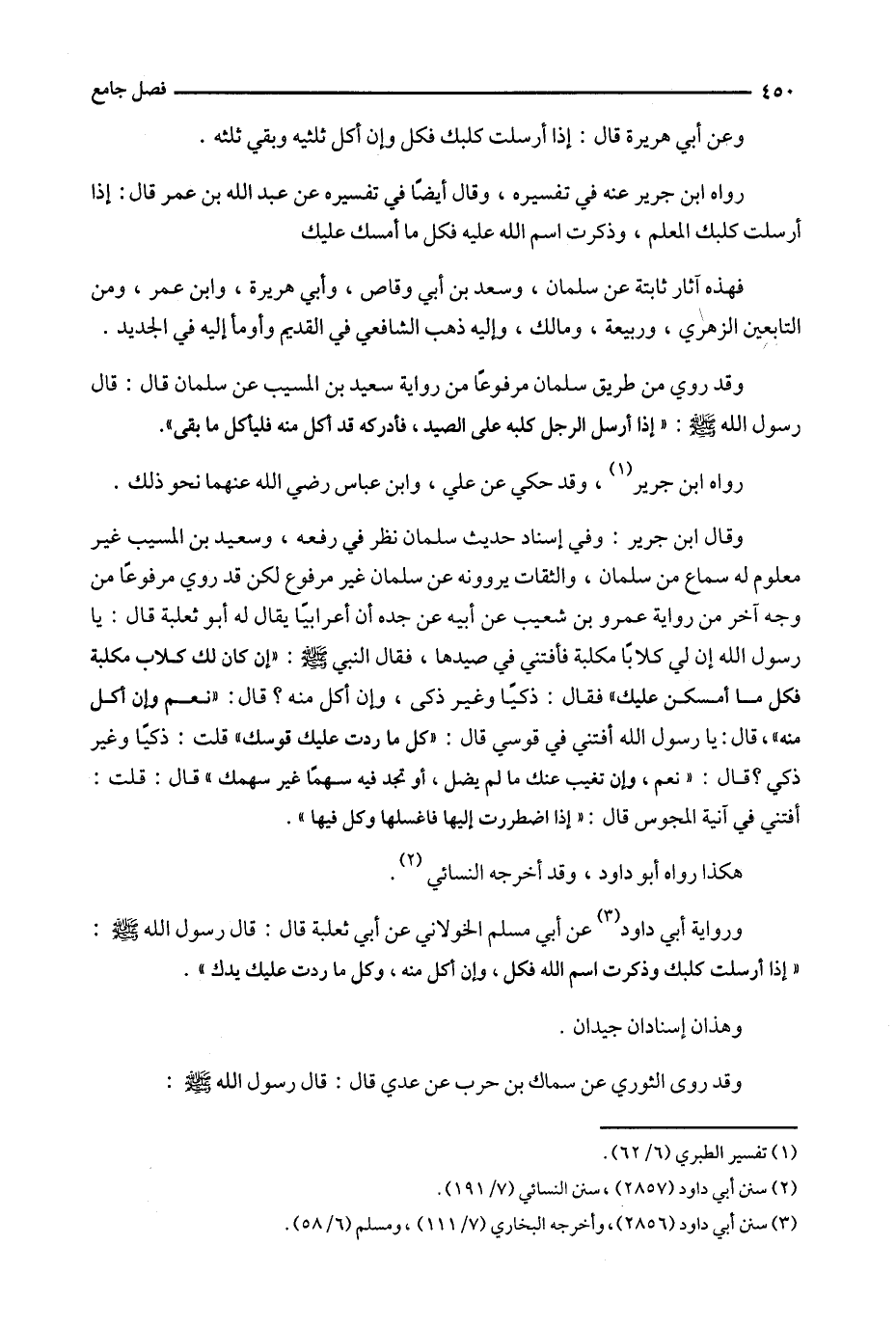 وقال ابن جرير : وفي إسناد حديث سلمان نظر في رفعه ، وسعيد بن المسيب غير معلوم له سماع من سلمان ، والثقات يروونه عن سلمان غير مرفوع لكن قد روي مرفوعاً من وجه آخر من رواية عمرو بن شعيب عن ابيه عن جده أن أعرابياً يقال له أبو ثعلبة قال : يا رسول الله إن لي كلاباً مكبله فأفتني في صيدها ، فقال النبي : ' إن كان لك كلاب مكبلة فكل ما أمسكن عليك ' فقال : ذكياً وغير ذكي ، وإن أكل منه ؟ ، قال : ' نعم وإن أكل منه ' قال : يا رسول الله أفتني في قوسي قال : ' كل ما ردت عليك قوسك ' قلت : ذكياً وغير ذكي ؟ قال : ' نعم ، وإن تغيب عنك ما لم يضل ، أو تجد فيه سهماً غير سهمك ' قال : قلت : أفتني في آنية المجوس قال : ' إذا اضطررت إليها فاغسلها وكل فيها ' .