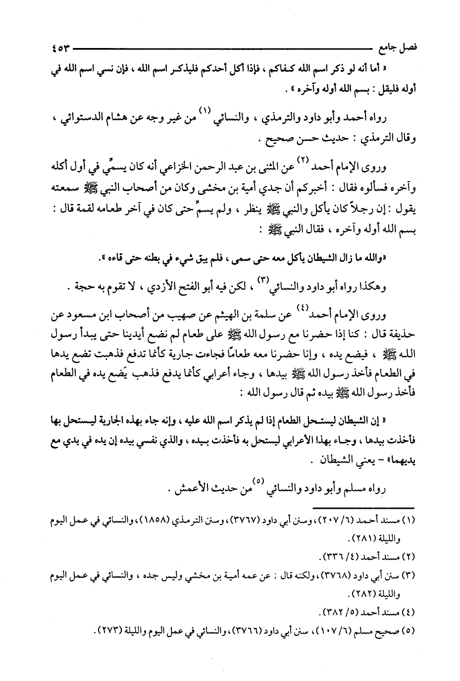 وروى الإمام أحمد ( 4 ) عن سلمة بن الهيثم عن صهيب من أصحاب ابن مسعود عن حذيفة قال : كنا إذا حضرنا مع رسول الله على طعام لم نضع أيدينا حتى يبدأ رسول الله ، فيضع يده ، وإنا حضرنا معه طعاماً فجاءت جارية كأنما تدفع فذهبت تضع يدها في الطعام فأخذ رسول الله بيدها ، وجاء أعرابي كأنما يدفع فذهب يَضع يده في الطعام فأخذ رسول الله بيده ثم قال رسول الله : ' إن الشيطان ليستحل الطعام إذا لم يذكر اسم الله عليه ، وإنه جاء بهذه الجارية ليستحل بها فأخذت بيدها ، وجاء بهذا الأعرابي ليستحل به فأخذت بيده ، والذي نفسي بيده إن يده في يدي مع يديهما ' - يعني الشيطان .