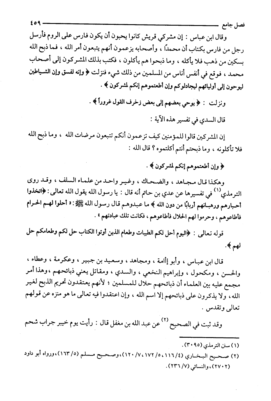 قال السدي في تفسير هذه الآية : إن المشركين قالوا للمؤمنين كيف تزعمون أنكم تتبعون مرضات الله ، وما ذبح الله فلا تأكلونه ، وما ذبحتم أنتم أكلتموه ؟ قال الله : ( ^ وإن أطعتموهم إنكم لمشركون ) .