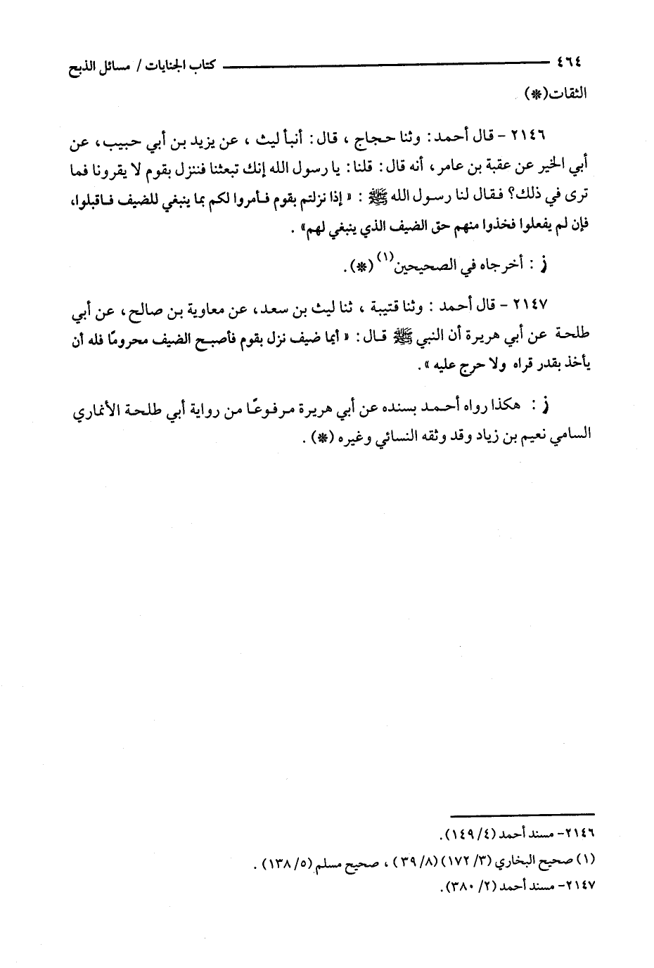 2147 - قال أحمد : وثنا قتيبة ، ثنا ليث بن سعد ، عن معاوية بن صالح ، عن أبي طلحة عن أبي هريرة أن النبي قال : ' أيما ضيف نزل بقوم فأصبح الضيف محروماً فله أن يأخذ بقدر قراه ولا حرج عليه ' .