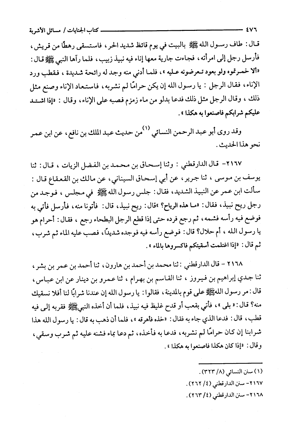 2167 - قال الدارقطني : وثنا إسحاق بن محمد بن الفضل الزيات ، قال : ثنا يوسف بن موسى ، ثنا جرير ، عن أبي إسحاق السيناني ، عن مالك بن القعقاع قال : سألت ابن عمر عن النبيذ الشديد ، فقال : جلس رسول الله في مجلس فوجد من رجل ريح نبيذ فقال ' ما هذه الرياح ؟ ' قال : ريح نبيذ ، قال : فأتونا منه ، فأرسل فأتي به فوضع فيه رأسه فشمه ، ثم رجع فرده حتى إذا قطع الرجل البطحاء رجع ، فقال : أحرام هو يا رسول الله ، أم حلال ؟ قال : فوضع رأسه فيه فوجده شديداً ، فصب عليه الماء ثم شرب ، ثم قال : ' إذا اغتلمت أسقيتكم فاكسروها بالماء ' .