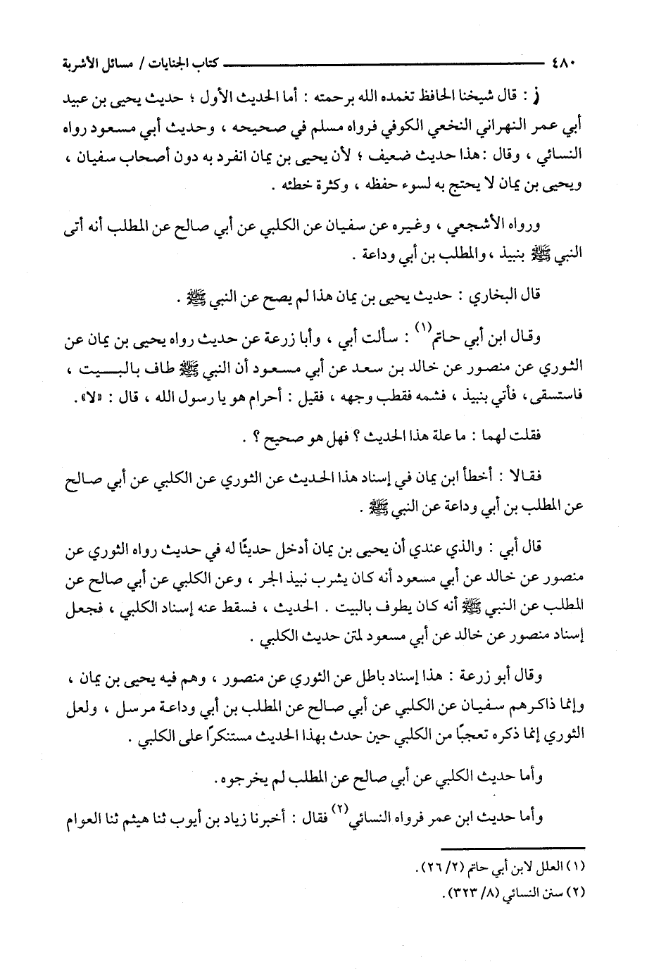 ز : قال شيخنا الحافظ تغمده الله برحمته : أما الحديث الأول ؛ حديث يحيى بن عبيد أبي عمر النهراني النخعي الكوفي فرواه مسلم في صحيحه ، وحديث أبي مسعود رواه النسائي ، وقال : (1) ؛ لأن يحيى بن يمان انفرد به دون أصحاب سفيان ، ويحيى بن يمان لا يحتج به لسوء حفظه ، وكثرة خطئه .