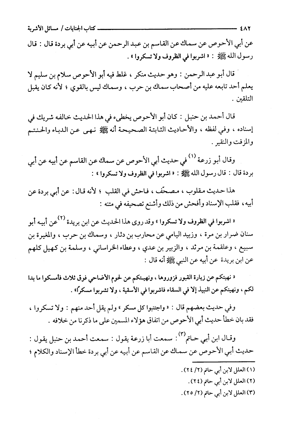 قال أحمد بن حنبل : كان أبو الأحوص يخطئ في هذا الحديث خالفه شريك في إسناده ، وفي لفظه ، والأحاديث الثابتة الصحيحة أنه نهى عن الدباء والحنتم والمزفت والنقير .