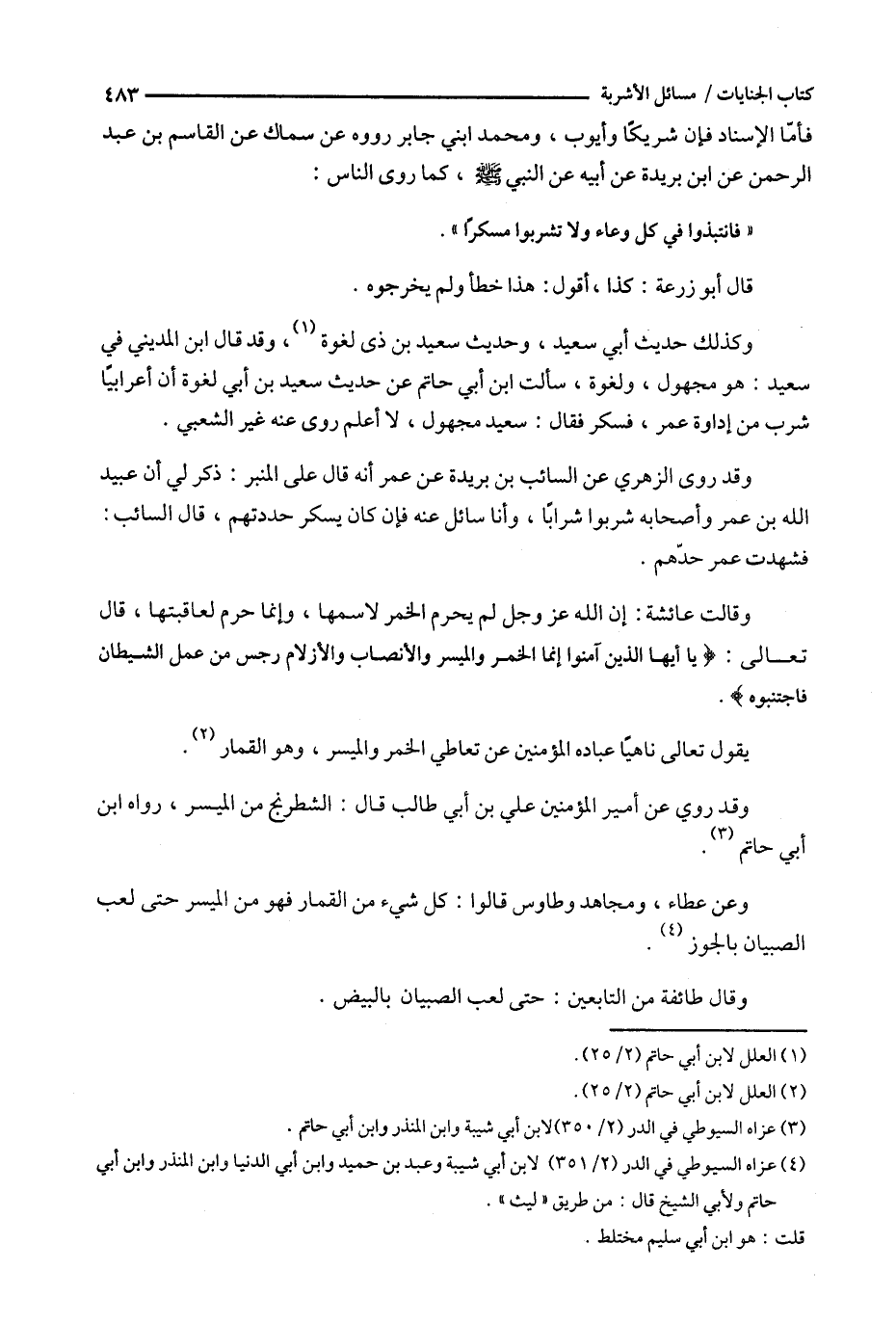 وقد روي عن أمير المؤمنين علي بن أبي طالب قال : الشطرنج من الميسر ، رواه ابن أبي حاتم ( 3 ) .