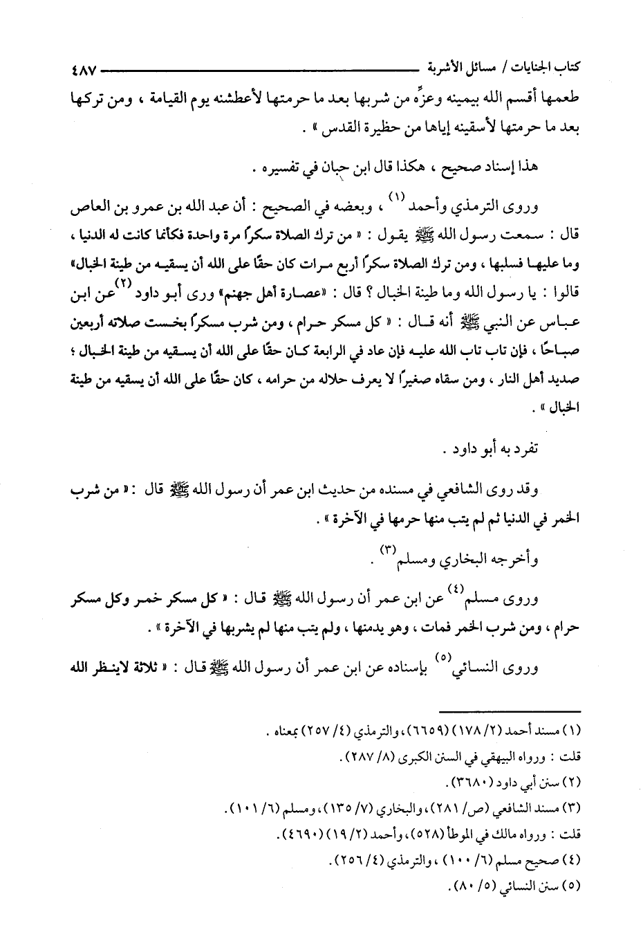 وروى الترمذي وأحمد ( 1 ) ، وبعضه في الصحيح : أن عبد الله بن عمرو بن العاص قال : سمعت رسول الله يقول : ' من ترك الصلاة سكراً مرة واحدة فكأنما كانت له الدنيا ، وما عليها فسلبها ، ومن ترك الصلاة سكراً أربع مرات كان حقاً على الله أن يسقيه من طينة الخبال ' قالوا : يا رسول الله وما طينة الخبال ؟ قال : ' عصارة أهل جهنم ' وروى أبو داود ( 2 ) عن ابن عباس عن النبي أنه قال : ' كل مسكر حرام ، ومن شرب مسكراً بخست صلاته أربعين صباحاً ، فإن تاب الله عليه فإن عاد في الرابعة كان حقاً على الله أن يسقيه من طينة الخبال ؛ صديد أهل النار ، ومن سقاه صغيراً لا يعرف حلاله من حرامه ، كان حقاً على الله أن يسقيه من طينة الخبال ' .