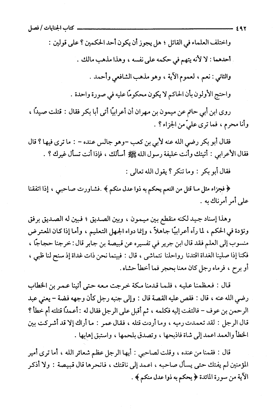 قال : فقمنا من عنده ، وقلت لصاحبي : أيها الرجل عظم شعائر الله ، أما ترى أمير المؤمنين لم يفتك حتى يسأل صاحبه ، اعمد إلى ناقتك ، فانحرها قال قبيصة : ولا أذكر الآية من سورة المائدة ( ^ يحكم به ذوا عدل منكم ) .
