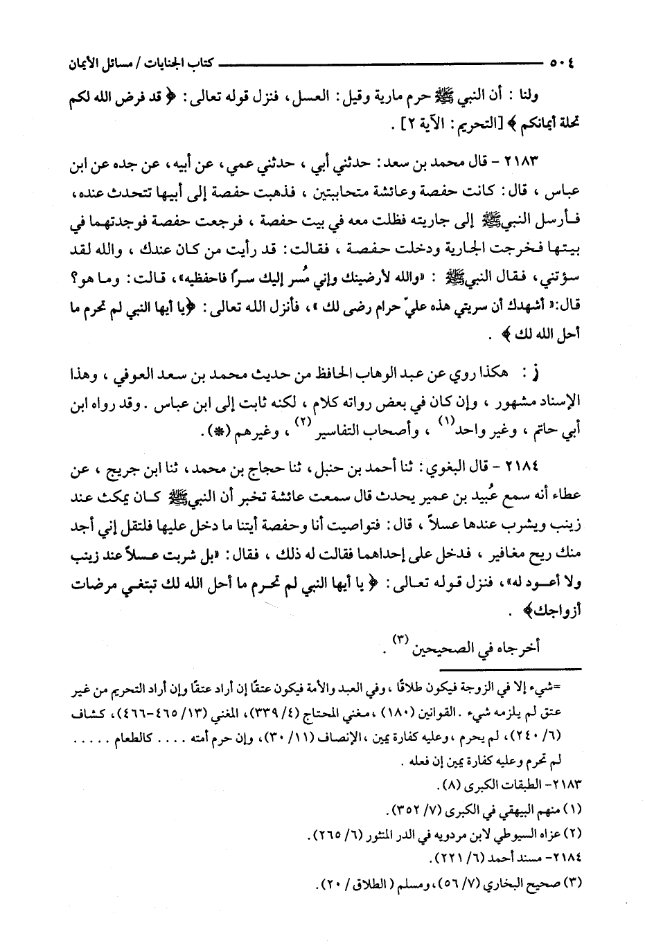 2183 - قال محمد بن سعد : حدثني أبي ، حدثني عمي ، عن أبيه ، عن جده عن ابن عباس ، قال : كانت حفصة وعائشة متحاببتين ، فذهبت حفصة إلى أبيها تتحدث عنده ، فأرسل النبي إلى جاريته فظلت معه في بيت حفصة فرجعت حفصة فوجدتهما في بيتها فخرجت الجارية ودخلت حفصة ، فقالت : قد رأيت من كان عندك ، والله لقد سؤتني ، فقال النبي : ' والله لأرضينك وإني مُسر إليك سراً فاحفظيه ' ، قالت : وما هو ؟ قال : ' أشهدك أن سريتي هذه عليّ حرام رضى لك ' ، فأنزل الله تعالى ( ^ يا أيها النبي لم تحرم ما أحل الله لك ) .