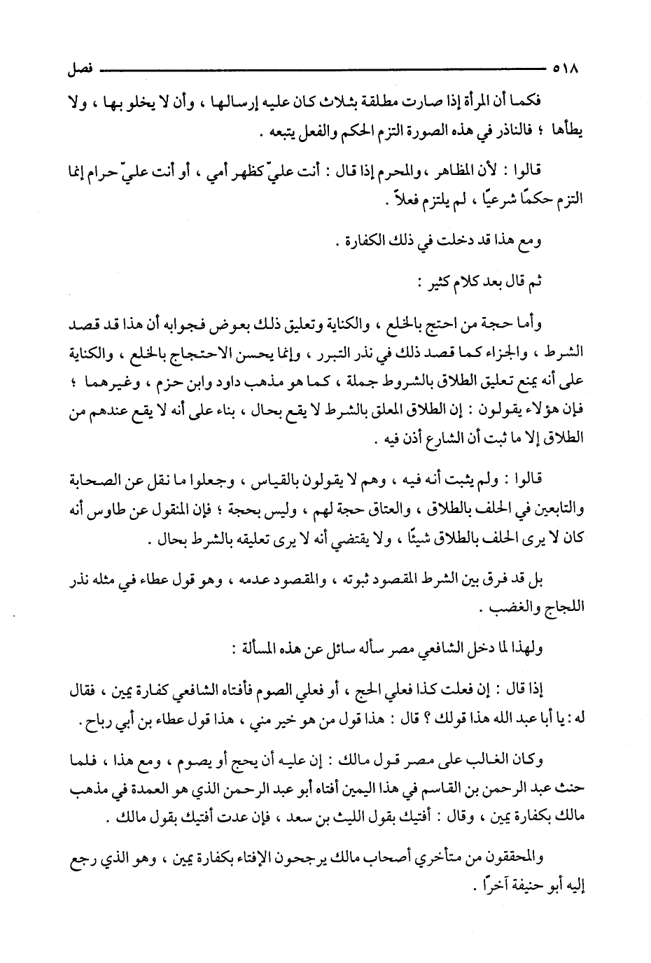 وكان الغالب على مصر قول مالك : إن عليه أن يحج أو يصوم ، ومع هذا ، فلما حنث عبد الرحمن بن القاسم في هذا اليمين أفتاه أبو عبد الرحمن الذي هو العمدة في مذهب مالك بكفارة يمين ، وقال : أفتيك بقول الليث بن سعد ، فإن عدت أفتيك بقول مالك .