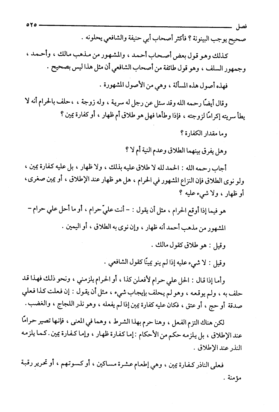 وقال أيضاً رحمه الله وقد سئل عن رجل له سرية ، وله زوجة ، حلف بالحرام أنه لا يطأ سريته إكراماً لزوجته ، فإذا وطأها فهل هو طلاق أم ظهار ، أو كفارة يمين ؟