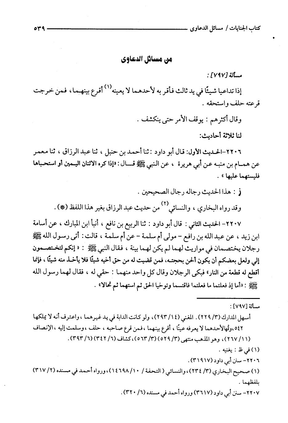 2207 - الحديث الثاني : قال أبو داود : ثنا الربيع بن نافع ، أنبأ ابن المبارك ، عن أسامة ابن زيد ، عن عبد الله بن رافع - مولى أم سلمة - عن أم سلمة ، قالت : أتى رسول الله رجلان يختصمان في مواريث لهما لم يكن لهما بينة ، فقال النبي : ' إنكم لتختصمون إلي ولعل بعضكم أن يكون ألحن بحجته ، فمن قضيت له من حق أخيه شيئاً فلا يأخذ منه شيئاً ، فإنما أقطع له قطعة من النار ' فبكى الرجلان وقال كل واحد منهما : حقي له ، فقال لهما رسول الله : ' أما إذ فعلتما ما فعلتما فاقتسما وتوخيا الحق ثم استهما ثم تحالا ' .