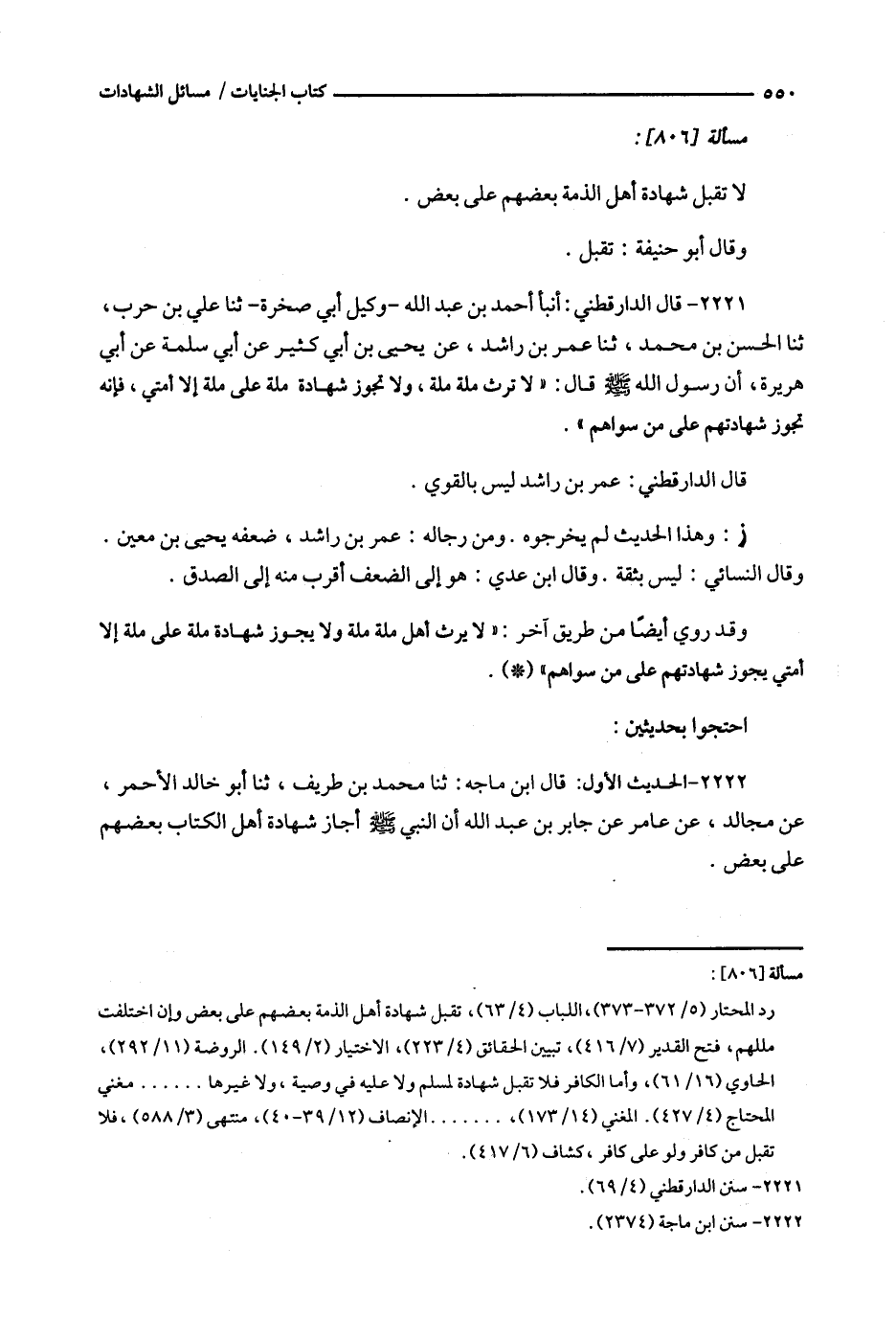 2222 - الحديث الأول : قال ابن ماجة : ثنا محمد بن طريف ، ثنا أبو خالد الأحمر ، عن مجالد ، عن عامر عن جابر بن عبد الله أن النبي أجاز شهادة أهل الكتاب بعضهم على بعض .