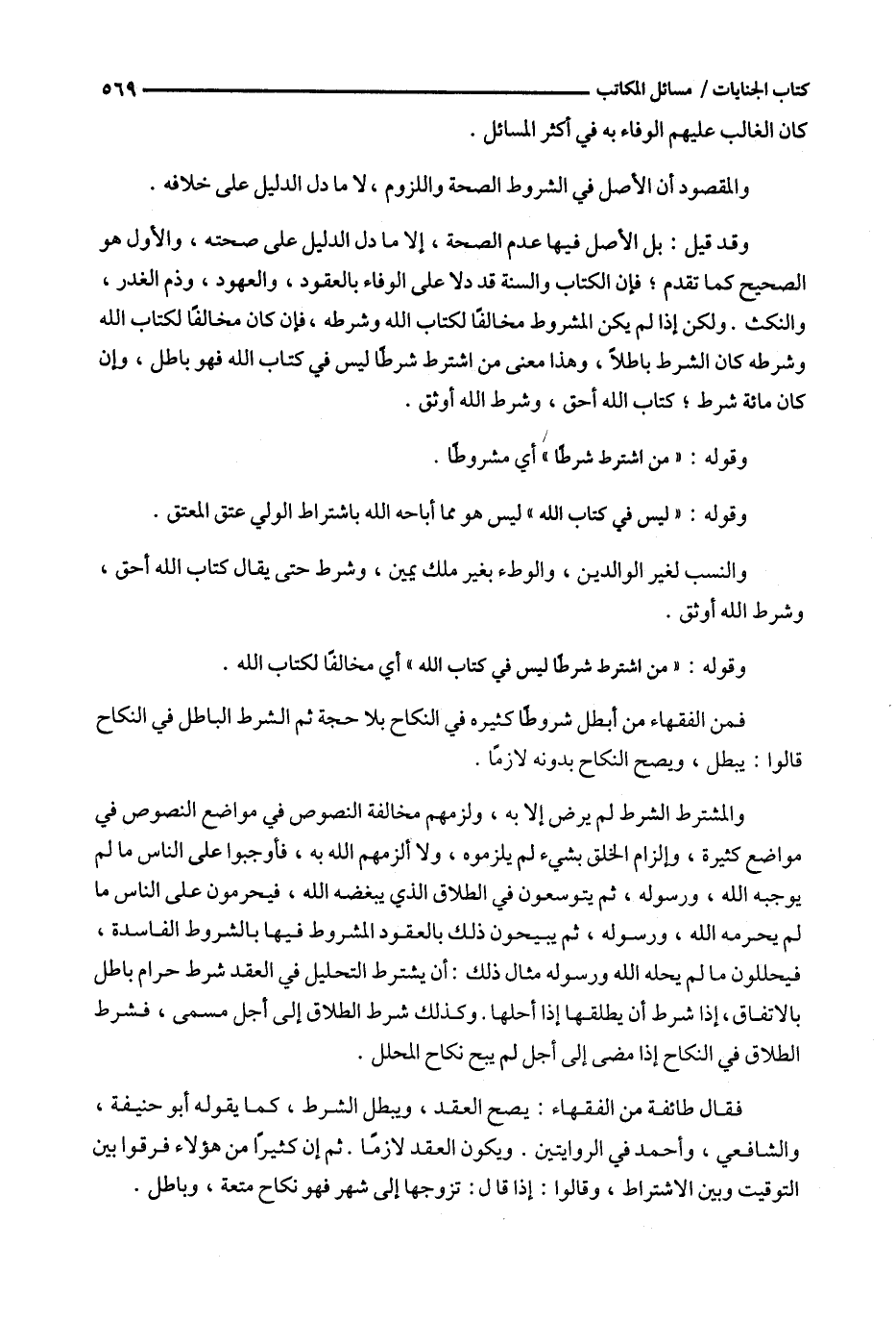 وقد قيل : بل الأصل فيها عدم الصحة ، إلا ما دل الدليل على صحته ، والأول هو الصحيح كما تقدم ؛ فإن الكتاب والسنة قد دلا على الوفاء بالعقود ، والعهود ، وذم الغدر ، والنكث . ولكن إذا لم يكن المشروط مخالفاً لكتاب الله وشرطه ، فإن كان مخالفاً لكتاب الله وشرطه كان الشرط باطلاً ، وهذا معنى من اشترط شرطاً ليس في كتاب الله فهو باطل ، وإن كان مائة شرط ؛ كتاب الله أحق ، وشرط الله أوثق .