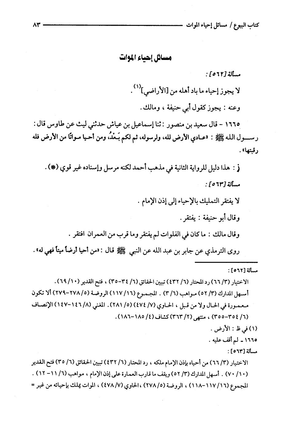 1665 - قال سعيد بن منصور : ثنا إسماعيل بن عياش حدثني ليث عن طاوس قال : رسول الله : ' عادي الأرض لله ، ولرسوله ، ثم لكم بَعْدُ ، ومن أحيا مواتاً من الأرض فله رقبتها ' .