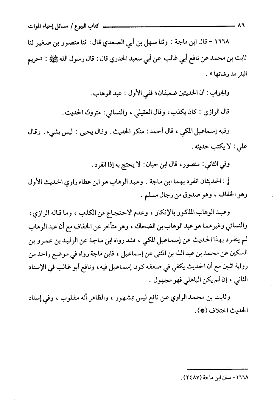 وعبد الوهاب المذكور بالإنكار ، وعدم الاحتجاج من الكذب ، وما قاله الرازي ، والنسائي وغيرهما هو عبد الوهاب بن الضحاك ، وهو متأخر عن الخفاف مع أن عبد الوهاب لم ينفرد بهذا الحديث عن إسماعيل المكي ، فقد رواه ابن ماجة عن الوليد بن عمرو بن السكين عن محمد بن عبد الله بن المثنى عن إسماعيل ، فابن ماجة رواه في موضع واحد من رواية اثنين مع أن الحديث يكفي في ضعفه كون إسماعيل فيه ، ونافع أبو غالب في الإسناد الثاني ، إن لم يكن الباهلي فهو مجهول .