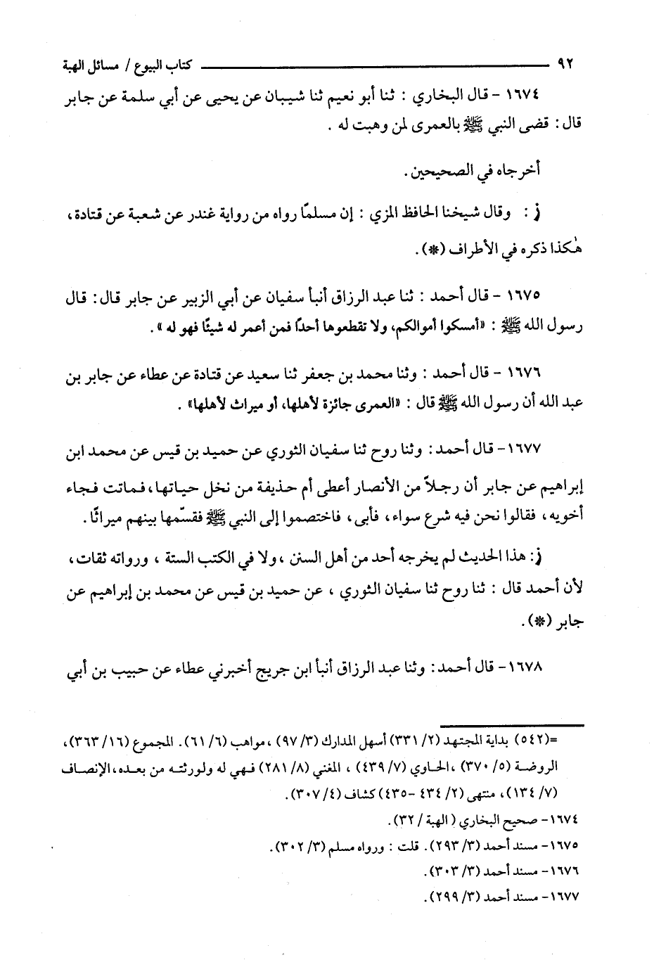 1674 - قال البخاري : ثنا أبو نعيم ثنا شيبان عن يحيى عن أبي سلمة عن جابر قال : قضى النبي بالعمرى لمن وهبت له .