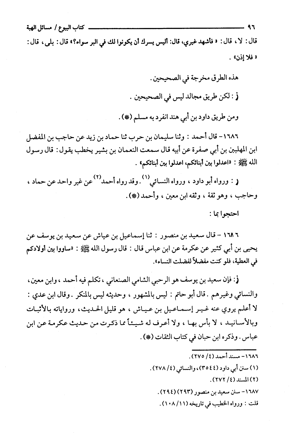 1686 - قال أحمد : وثنا سليمان بن حرب ثنا حماد بن زيد عن حاجب بن المفضل ابن المهلببن بن أبي صفرة عن أبيه قال سمعت النعمان بن بشير يخطب يقول : قال رسول الله : ' اعدلوا بين أبنائكم ، اعدلوا بين أبنائكم ' .