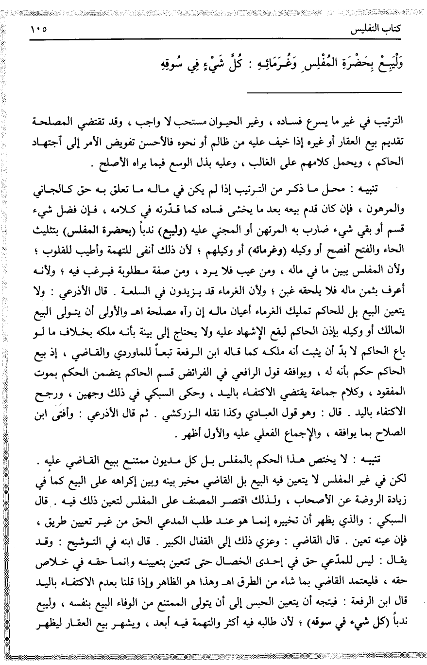 (وَلْيَبِعْ) نَدْبًا (بِحَضْرَةِ الْمُفْلِسِ) بِتَثْلِيثِ الْحَاءِ وَالْفَتْحُ أَفْصَحُ أَوْ وَكِيلِهِ (وَغُرَمَائِهِ) أَوْ وَكِيلِهِمْ؛ لِأَنَّ ذَلِكَ أَنْفَى لِلتُّهْمَةِ وَأَطْيَبُ لِلْقُلُوبِ؛ وَلِأَنَّ الْمُفْلِسَ يُبَيِّنُ مَا فِي مَالِهِ، وَمِنْ عَيْبٍ فَلَا يُرَدُّ، وَمِنْ صِفَةٍ مَطْلُوبَةٍ فَيُرْغَبُ فِيهِ؛ وَلِأَنَّهُ أَعْرَفُ بِثَمَنِ مَالِهِ فَلَا يَلْحَقُهُ غَبْنٌ؛ وَلِأَنَّ الْغُرَمَاءَ قَدْ يَزِيدُونَ فِي السِّلْعَةِ. قَالَ الْأَذْرَعِيُّ: وَلَا يَتَعَيَّنُ الْبَيْعُ بَلْ لِلْحَاكِمِ تَمْلِيكُ الْغُرَمَاءِ أَعْيَانَ مَالِهِ إنْ رَآهُ مَصْلَحَةً اهـ.