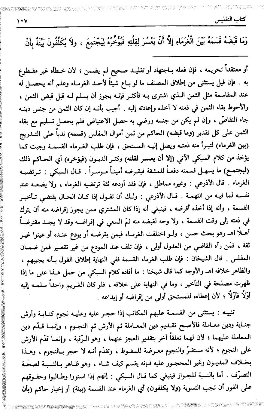 فَإِنْ قِيلَ يُسْتَثْنَى مِنْ إطْلَاقِ الْمُصَنِّفِ مَا لَوْ بَاعَ شَيْئًا لِأَحَدِ الْغُرَمَاءِ وَعَلِمَ أَنَّهُ يَحْصُلُ لَهُ عِنْدَ الْمُقَاسَمَةِ مِثْلُ الثَّمَنِ الَّذِي اشْتَرَى بِهِ فَأَكْثَرَ فَإِنَّهُ يَجُوزُ أَنْ يُسَلِّمَ لَهُ قَبْلَ قَبْضِ الثَّمَنِ، وَالْأَحْوَطُ بَقَاءُ الثَّمَنِ فِي ذِمَّتِهِ لَا أَخْذُهُ وَإِعَادَتُهُ إلَيْهِ.