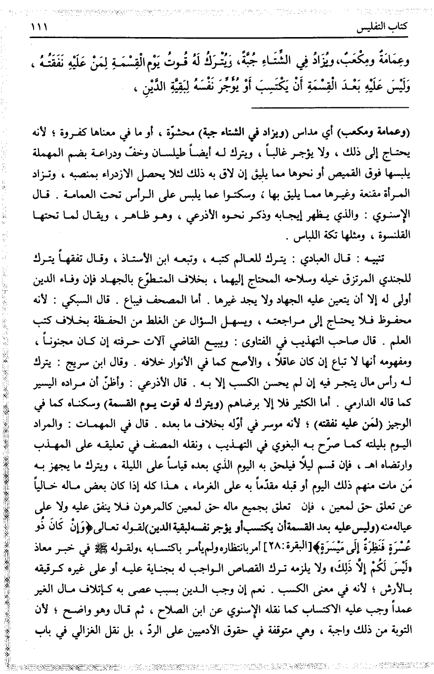 تَنْبِيهٌ قَالَ الْعَبَّادِيُّ: يُتْرَكُ لِلْعَالِمِ كُتُبُهُ، وَتَبِعَهُ ابْنُ الْأُسْتَاذِ، وَقَالَ تَفَقُّهًا يُتْرَكُ لِلْجُنْدِيِّ الْمُرْتَزِقِ خَيْلُهُ وَسِلَاحُهُ الْمُحْتَاجُ إلَيْهِمَا، بِخِلَافِ الْمُتَطَوِّعِ بِالْجِهَادِ فَإِنَّ وَفَاءَ الدَّيْنِ أَوْلَى لَهُ إلَّا أَنْ يَتَعَيَّنَ عَلَيْهِ الْجِهَادُ وَلَا يَجِدُ غَيْرَهَا. أَمَّا الْمُصْحَفُ فَيُبَاعُ. قَالَ السُّبْكِيُّ: لِأَنَّهُ مَحْفُوظٌ فَلَا يَحْتَاجُ إلَى مُرَاجَعَتِهِ، وَيَسْهُلُ السُّؤَالُ عَنْ الْغَلَطِ مِنْ الْحَفَظَةِ بِخِلَافِ كُتُبِ الْعِلْمِ. قَالَ صَاحِبُ التَّهْذِيبِ فِي الْفَتَاوَى: وَيَبِيعُ الْقَاضِي آلَاتِ حِرْفَتِهِ إنْ كَانَ مَجْنُونًا، وَمَفْهُومُهُ أَنَّهَا لَا تُبَاعُ إنْ كَانَ عَاقِلًا، وَالْأَصَحُّ كَمَا فِي الْأَنْوَارِ خِلَافُهُ. وَقَالَ ابْنُ سُرَيْجٍ: يُتْرَكُ لَهُ رَأْسُ مَالٍ يَتَّجِرُ فِيهِ إنْ لَمْ يُحْسِنْ الْكَسْبَ إلَّا بِهِ. قَالَ الْأَذْرَعِيُّ: وَأَظُنُّ أَنَّ مُرَادَهُ الْيَسِيرُ كَمَا قَالَهُ الدَّارِمِيُّ. أَمَّا الْكَثِيرُ فَلَا إلَّا بِرِضَاهُمْ (وَيُتْرَكُ لَهُ قُوتُ يَوْمِ الْقِسْمَةِ) وَسُكْنَاهُ كَمَا فِي الْوَجِيزِ (لِمَنْ عَلَيْهِ نَفَقَتُهُ) ؛ لِأَنَّهُ مُوسِرٌ فِي أَوَّلِهِ بِخِلَافِ مَا بَعْدَهُ. قَالَ فِي الْمُهِمَّاتِ: وَالْمُرَادُ الْيَوْمُ بِلَيْلَتِهِ كَمَا صَرَّحَ بِهِ الْبَغَوِيّ فِي التَّهْذِيبِ، وَنَقَلَهُ الْمُصَنِّفُ فِي تَعْلِيقِهِ عَلَى الْمُهَذَّبِ وَارْتَضَاهُ اهـ.