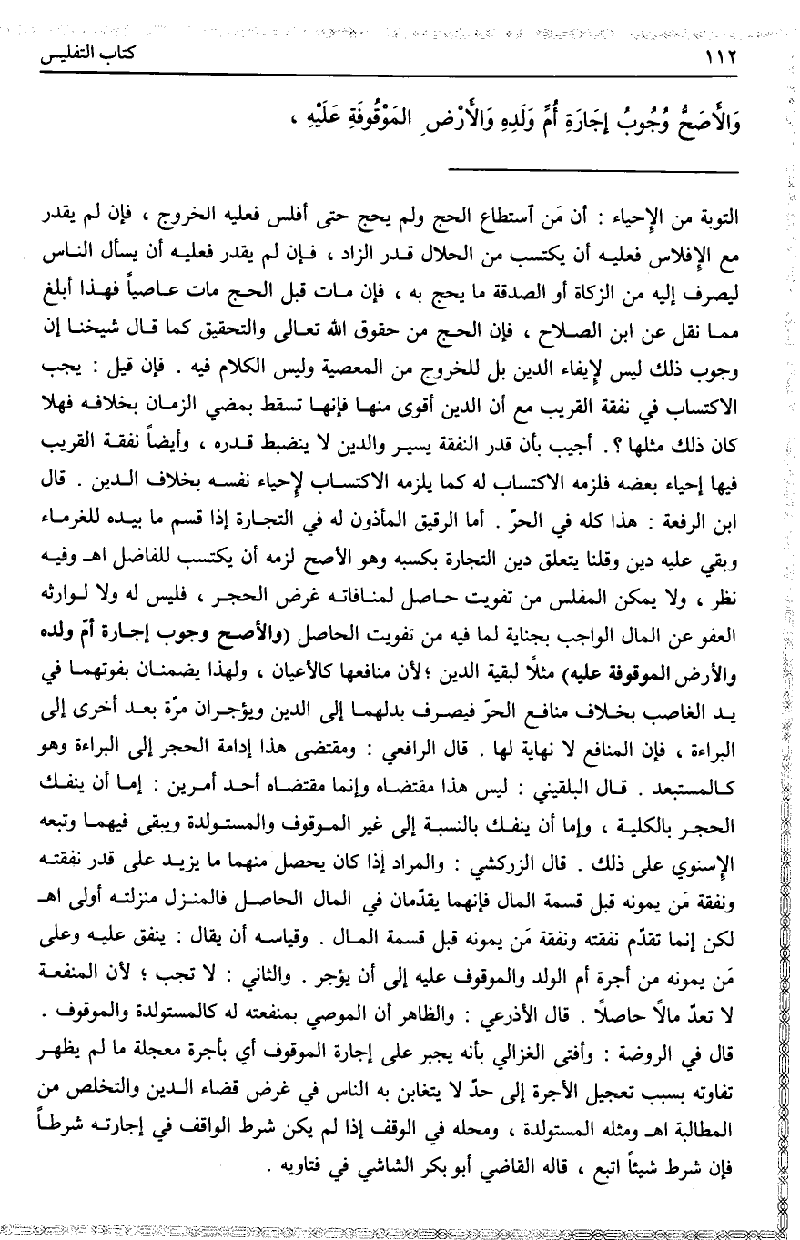 وَلَا يُمْكِنُ الْمُفْلِسُ مِنْ تَفْوِيتِ حَاصِلٍ لِمُنَافَاتِهِ غَرَضَ الْحَجْرِ، فَلَيْسَ لَهُ وَلَا لِوَارِثِهِ الْعَفْوُ عَنْ الْمَالِ الْوَاجِبِ بِجِنَايَةٍ لِمَا فِيهِ مِنْ تَفْوِيتِ الْحَاصِلِ (وَالْأَصَحُّ وُجُوبُ إجَارَةِ أُمِّ وَلَدِهِ وَالْأَرْضِ الْمَوْقُوفَةِ عَلَيْهِ) مَثَلًا لِبَقِيَّةِ الدَّيْنِ؛ لِأَنَّ مَنَافِعَهَا كَالْأَعْيَانِ، وَلِهَذَا يَضْمَنَانِ بِفَوْتِهِمَا فِي يَدِ الْغَاصِبِ بِخِلَافِ مَنَافِعِ الْحُرِّ فَيَصْرِفُ بَدَلَهُمَا إلَى الدَّيْنِ وَيُؤَجِّرَانِ مَرَّةً بَعْدَ أُخْرَى إلَى الْبَرَاءَةِ، فَإِنَّ الْمَنَافِعَ لَا نِهَايَةَ لَهَا. قَالَ الرَّافِعِيُّ: وَمُقْتَضَى هَذَا إدَامَةُ الْحَجْرِ إلَى الْبَرَاءَةِ وَهُوَ كَالْمُسْتَبْعَدِ. قَالَ الْبُلْقِينِيُّ: لَيْسَ هَذَا مُقْتَضَاهُ وَإِنَّمَا مُقْتَضَاهُ أَحَدُ أَمْرَيْنِ: إمَّا أَنْ يَنْفَكَّ الْحَجْرُ بِالْكُلِّيَّةِ، وَإِمَّا أَنْ يَنْفَكَّ بِالنِّسْبَةِ إلَى غَيْرِ الْمَوْقُوفِ وَالْمُسْتَوْلَدَةِ وَيَبْقَى فِيهِمَا وَتَبِعَهُ الْإِسْنَوِيُّ عَلَى ذَلِكَ. قَالَ الزَّرْكَشِيُّ: وَالْمُرَادُ إذَا كَانَ يَحْصُلُ مِنْهُمَا مَا يَزِيدُ عَلَى قَدْرِ نَفَقَتِهِ وَنَفَقَةِ مَنْ يَمُونُهُ قَبْلَ قِسْمَةِ الْمَالِ فَإِنَّهُمَا يُقَدَّمَانِ فِي الْمَالِ الْحَاصِلِ فَالْمُنَزَّلُ مَنْزِلَتُهُ أَوْلَى اهـ.
