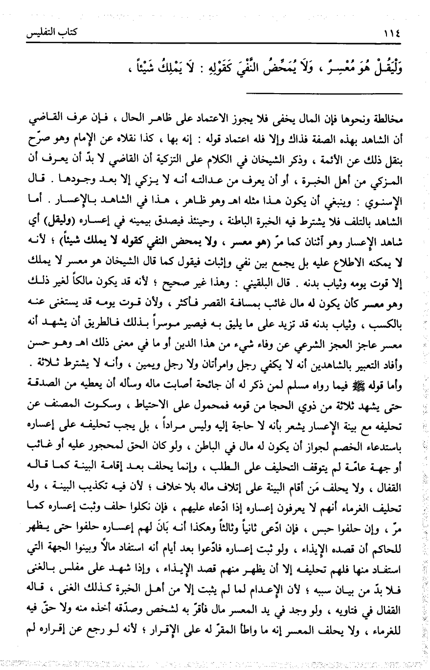 وَهُوَ ظَاهِرٌ، هَذَا فِي الشَّاهِدِ بِالْإِعْسَارِ. أَمَّا الشَّاهِدُ بِالتَّلَفِ فَلَا يُشْتَرَطُ فِيهِ الْخِبْرَةُ الْبَاطِنَةُ، وَحِينَئِذٍ فَيُصَدَّقُ بِيَمِينِهِ فِي إعْسَارِهِ (وَلْيَقُلْ) أَيْ شَاهِدُ الْإِعْسَارِ وَهُوَ اثْنَانِ كَمَا مَرَّ (هُوَ مُعْسِرٌ، وَلَا يُمَحِّضُ النَّفْيَ كَقَوْلِهِ لَا يَمْلِكُ شَيْئًا) ؛ لِأَنَّهُ لَا يُمْكِنُهُ الِاطِّلَاعُ عَلَيْهِ بَلْ يَجْمَعُ بَيْنَ نَفْيٍ وَإِثْبَاتٍ فَيَقُولُ كَمَا قَالَ الشَّيْخَانِ هُوَ مُعْسِرٌ لَا يَمْلِكُ إلَّا قُوتَ يَوْمِهِ وَثِيَابَ بَدَنِهِ. قَالَ الْبُلْقِينِيُّ: وَهَذَا غَيْرُ صَحِيحٍ؛ لِأَنَّهُ قَدْ يَكُونُ مَالِكًا لِغَيْرِ ذَلِكَ وَهُوَ مُعْسِرٌ كَأَنْ يَكُونَ لَهُ مَالٌ غَائِبٌ بِمَسَافَةِ الْقَصْرِ فَأَكْثَرَ، وَلِأَنَّ قُوتَ يَوْمِهِ قَدْ يُسْتَغْنَى عَنْهُ بِالْكَسْبِ، وَثِيَابَ بَدَنِهِ قَدْ تَزِيدُ عَلَى مَا يَلِيقُ بِهِ فَيَصِيرُ مُوسِرًا بِذَلِكَ فَالطَّرِيقُ أَنْ يَشْهَدَ أَنَّهُ مُعْسِرٌ عَاجِزٌ الْعَجْزَ الشَّرْعِيَّ عَنْ وَفَاءِ شَيْءٍ مِنْ هَذَا الدَّيْنِ أَوْ مَا فِي مَعْنَى، ذَلِكَ اهـ.