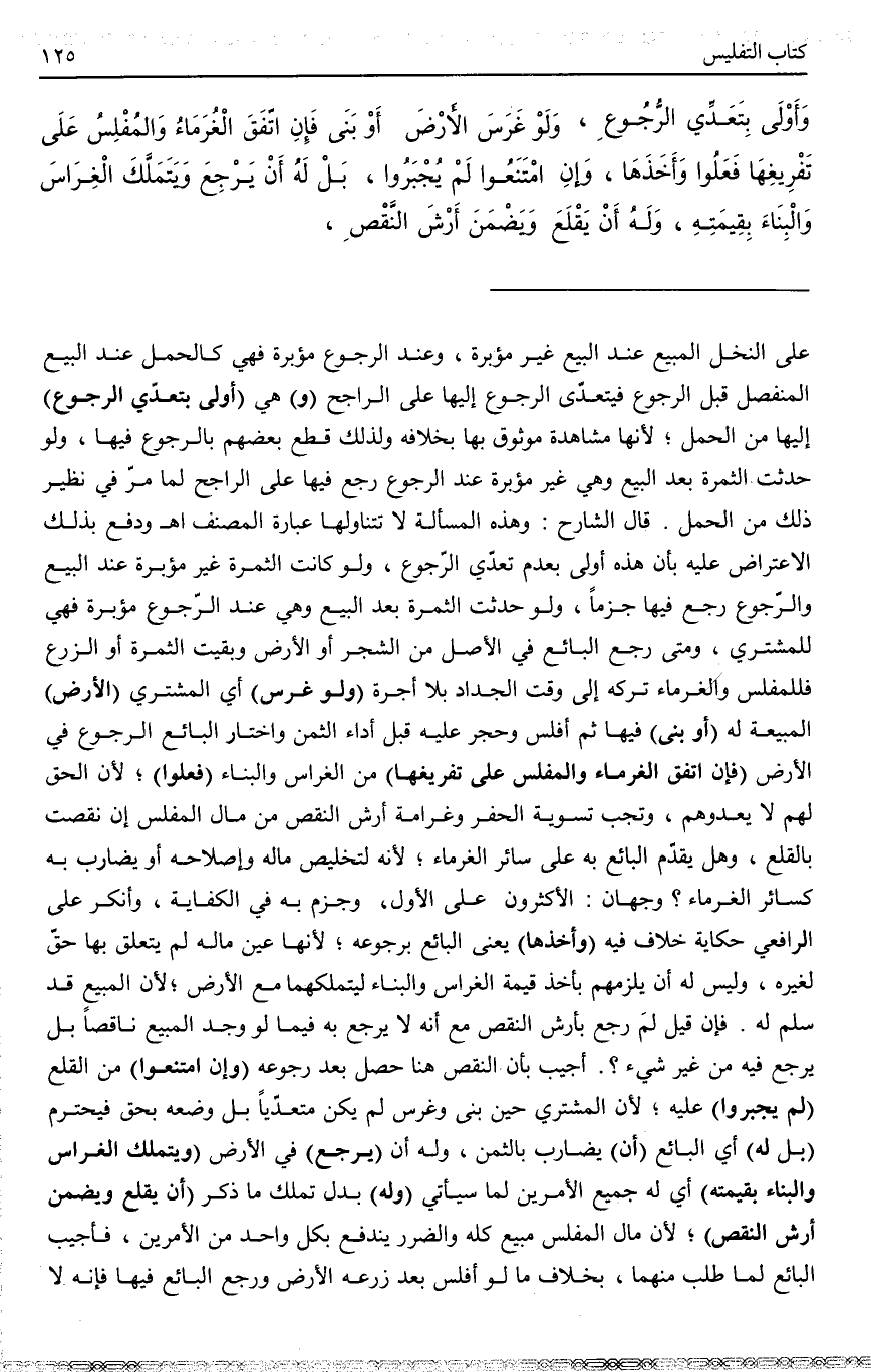 (وَلَوْ غَرَسَ) أَيْ الْمُشْتَرِي (الْأَرْضَ) الْمَبِيعَةَ لَهُ (أَوْ بَنَى) فِيهَا ثُمَّ أَفْلَسَ وَحُجِرَ عَلَيْهِ قَبْلَ أَدَاءِ الثَّمَنِ وَاخْتَارَ الْبَائِعُ الرُّجُوعَ فِي الْأَرْضِ (فَإِنْ اتَّفَقَ الْغُرَمَاءُ وَالْمُفْلِسُ عَلَى تَفْرِيغِهَا) مِنْ الْغِرَاسِ وَالْبِنَاءِ (فَعَلُوا) ؛ لِأَنَّ الْحَقَّ لَهُمْ لَا يَعْدُوهُمْ، وَتَجِبُ تَسْوِيَةُ الْحُفَرِ وَغَرَامَةُ أَرْشِ النَّقْصِ مِنْ مَالِ الْمُفْلِسِ إنْ نَقَصَتْ بِالْقَلْعِ، وَهَلْ يُقَدِّمُ الْبَائِعُ بِهِ عَلَى سَائِرِ الْغُرَمَاءِ؛ لِأَنَّهُ لِتَخْلِيصِ مَالِهِ وَإِصْلَاحِهِ أَوْ يُضَارِبُ بِهِ كَسَائِرِ الْغُرَمَاءِ؟ وَجْهَانِ: الْأَكْثَرُونَ عَلَى الْأَوَّلِ، وَجَزَمَ بِهِ فِي الْكِفَايَةِ، وَأَنْكَرَ عَلَى الرَّافِعِيِّ حِكَايَةَ خِلَافٍ فِيهِ (وَأَخَذَهَا) يَعْنِي الْبَائِعَ بِرُجُوعِهِ؛ لِأَنَّهَا عَيْنُ مَالِهِ لَمْ يَتَعَلَّقْ بِهَا حَقٌّ لِغَيْرِهِ، وَلَيْسَ لَهُ أَنْ يُلْزِمَهُمْ بِأَخْذِ قِيمَةِ الْغِرَاسِ وَالْبِنَاءِ لِيَتَمَلَّكَهُمَا مَعَ الْأَرْضِ؛ لِأَنَّ الْمَبِيعَ قَدْ سَلِمَ لَهُ.