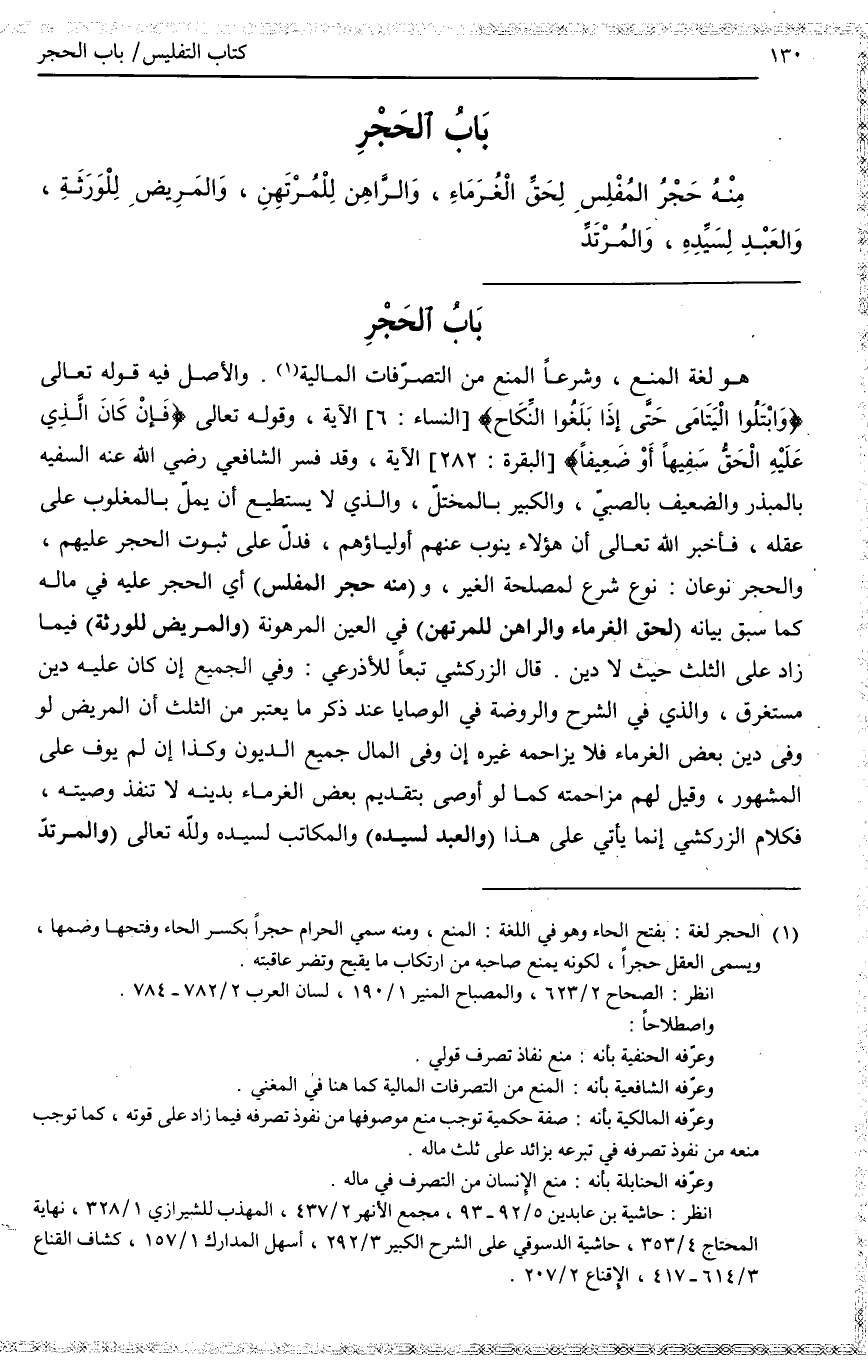 بَابُ الْحَجْرِ مِنْهُ حَجْرُ الْمُفْلِسِ لِحَقِّ الْغُرَمَاءِ، وَالرَّاهِنِ لِلْمُرْتَهِنِ، وَالْمَرِيضِ لِلْوَرَثَةِ، وَالْعَبْدِ لِسَيِّدِهِ، وَالْمُرْتَدِّ