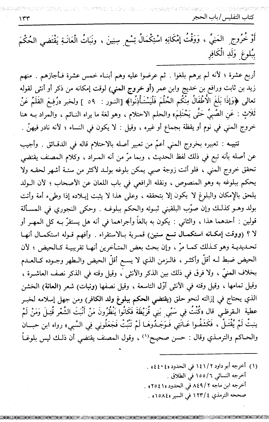 ـــــــــــــــــــــــــــــQأَرْبَعَ عَشْرَةَ؛ لِأَنَّهُ لَمْ يَرَهُمْ بَلَغُوا. ثُمَّ عُرِضُوا عَلَيْهِ وَهُمْ أَبْنَاءُ خَمْسَ عَشْرَةَ فَأَجَازَهُمْ. مِنْهُمْ زَيْدُ بْنُ ثَابِتٍ وَرَافِعُ بْنُ خَدِيجٍ وَابْنُ عُمَرَ» (أَوْ خُرُوجِ الْمَنِيِّ) لِوَقْتِ إمْكَانِهِ مِنْ ذَكَرٍ أَوْ أُنْثَى لِقَوْلِهِ تَعَالَى {وَإِذَا بَلَغَ الأَطْفَالُ مِنْكُمُ الْحُلُمَ فَلْيَسْتَأْذِنُوا} [النور: 59] وَلِخَبَرِ «رُفِعَ الْقَلَمُ عَنْ ثَلَاثٍ: عَنْ الصَّبِيِّ حَتَّى يَحْتَلِمَ» وَالْحُلُمُ الِاحْتِلَامُ، وَهُوَ لُغَةً مَا يَرَاهُ النَّائِمُ، وَالْمُرَادُ بِهِ هُنَا خُرُوجُ الْمَنِيِّ فِي نَوْمٍ أَوْ يَقِظَةٍ بِجِمَاعٍ أَوْ غَيْرِهِ، وَقِيلَ: لَا يَكُونُ فِي النِّسَاءِ؛ لِأَنَّهُ نَادِرٌ فِيهِنَّ.