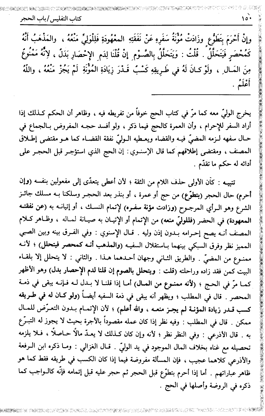 (وَإِنْ أَحْرَمَ) حَالَ الْحَجْرِ (بِتَطَوُّعٍ) مِنْ حَجٍّ أَوْ عُمْرَةٍ، أَوْ بِنَذْرٍ بَعْدَ الْحَجْرِ وَسَلَكْنَا بِهِ مَسْلَكَ جَائِزِ الشَّرْعِ وَهُوَ الرَّأْيُ الْمَرْجُوحُ (وَزَادَتْ مُؤْنَةُ سَفَرِهِ) لِإِتْمَامِ النُّسُكِ، أَوْ إتْيَانِهِ بِهِ (عَنْ نَفَقَتِهِ الْمَعْهُودَةِ) فِي الْحَضَرِ (فَلِلْوَلِيِّ مَنْعُهُ) مِنْ الْإِتْمَامِ أَوْ الْإِتْيَانِ بِهِ صِيَانَةً لِمَالِهِ، وَظَاهِرُ كَلَامِ الْمُصَنِّفِ أَنَّهُ يَصِحُّ إحْرَامُهُ بِدُونِ إذْنِ وَلِيِّهِ. قَالَ الْإِسْنَوِيُّ: وَفِي الْفَرْقِ بَيْنَهُ وَبَيْنَ الصَّبِيِّ الْمُمَيَّزِ نَظَرٌ وَفَرَّقَ السُّبْكِيُّ بَيْنَهُمَا بِاسْتِقْلَالِ السَّفِيهِ (وَالْمَذْهَبُ أَنَّهُ كَمُحْصَرٍ فَيَتَحَلَّلُ) ؛ لِأَنَّهُ مَمْنُوعٌ مِنْ الْمُضِيِّ. وَالطَّرِيقُ الثَّانِي وَجْهَانِ: أَحَدُهُمَا هَذَا. وَالثَّانِي: لَا يَتَحَلَّلُ إلَّا بِلِقَاءِ الْبَيْتِ كَمَنْ فَقَدْ زَادَهُ وَرَاحِلَتَهُ (قُلْت: وَيَتَحَلَّلُ بِالصَّوْمِ إنْ قُلْنَا لِدَمِ الْإِحْصَارِ بَدَلٌ) وَهُوَ الْأَظْهَرُ كَمَا مَرَّ فِي الْحَجِّ؛ (لِأَنَّهُ مَمْنُوعٌ مِنْ الْمَالِ) أَمَّا إذَا قُلْنَا لَا بَدَلَ لَهُ فَإِنَّهُ يَبْقَى فِي ذِمَّةِ الْمُحْصَرِ. قَالَ فِي الْمَطْلَبِ؛ وَيَظْهَرُ أَنَّهُ يَبْقَى فِي ذِمَّةِ السَّفِيهِ أَيْضًا (وَلَوْ كَانَ لَهُ فِي طَرِيقِهِ كَسْبٌ قَدْرَ زِيَادَةِ الْمُؤْنَةِ لَمْ يَجُزْ مَنْعُهُ، وَاَللَّهُ أَعْلَمُ) ؛ لِأَنَّ الْإِتْمَامَ بِدُونِ التَّعَرُّضِ لِلْمَالِ مُمْكِنٌ. قَالَ فِي الْمَطْلَبِ: وَفِيهِ نَظَرٌ إذَا كَانَ عَمَلُهُ مَقْصُودًا بِالْأُجْرَةِ بِحَيْثُ لَا يَجُوزُ لَهُ التَّبَرُّعُ بِهِ. قَالَ الْأَذْرَعِيُّ: وَفِي النَّظَرِ نَظَرٌ؛ لِأَنَّهُ وَإِنْ كَانَ كَذَلِكَ لَا يُعَدُّ مَالًا حَاصِلًا، فَلَا يَلْزَمُهُ تَحْصِيلُهُ مَعَ غِنَاهُ بِخِلَافِ الْمَالِ الْمَوْجُودِ فِي يَدِ الْوَلِيِّ. قَالَ الْغَزَالِيُّ: وَمَا ذَكَرَهُ ابْنُ الرِّفْعَةِ وَالْأَذْرَعِيُّ كِلَاهُمَا عَجِيبٌ، فَإِنَّ الْمَسْأَلَةَ مَفْرُوضَةٌ فِيمَا إذَا كَانَ الْكَسْبُ فِي طَرِيقِهِ فَقَطْ كَمَا هُوَ ظَاهِرُ عِبَارَاتِهِمْ. أَمَّا إذَا أَحْرَمَ بِتَطَوُّعٍ قَبْلَ الْحَجْرِ ثُمَّ حُجِرَ عَلَيْهِ قَبْلَ إتْمَامِهِ فَإِنَّهُ كَالْوَاجِبِ كَمَا ذَكَرَهُ فِي الرَّوْضَةِ وَأَصْلِهَا فِي الْحَجِّ.