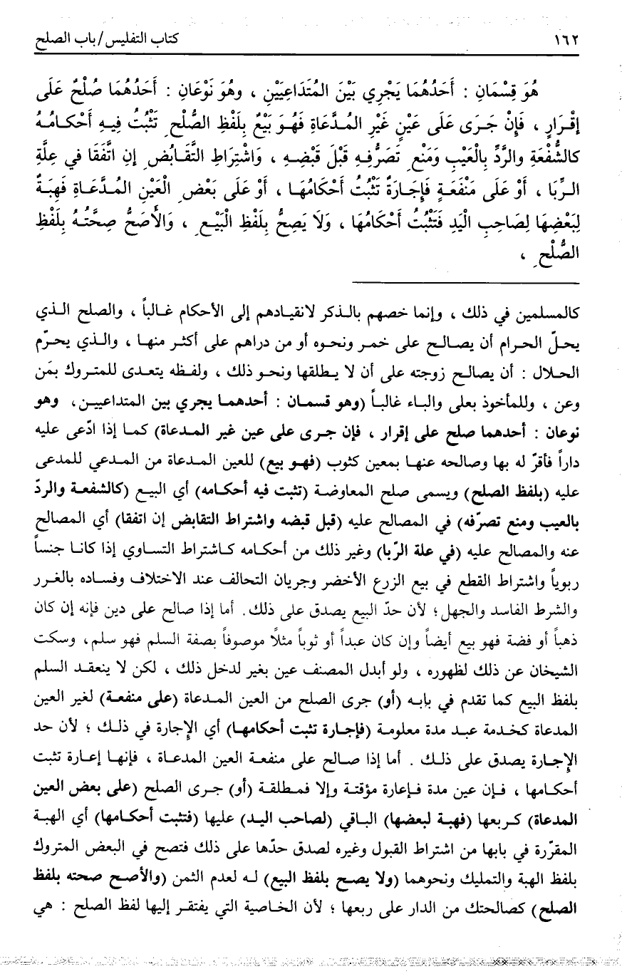 وَهُوَ قِسْمَانِ: أَحَدُهُمَا يَجْرِي بَيْنَ الْمُتَدَاعِيَيْنِ، وَهُوَ نَوْعَانِ: أَحَدُهُمَا صُلْحٌ عَلَى إقْرَارٍ، فَإِنْ جَرَى عَلَى عَيْنٍ غَيْرِ الْمُدَّعَاةِ فَهُوَ بَيْعٌ بِلَفْظِ الصُّلْحِ تَثْبُتُ فِيهِ أَحْكَامُهُ كَالشُّفْعَةِ وَالرَّدِّ بِالْعَيْبِ وَمَنْعِ تَصَرُّفِهِ قَبْلَ قَبْضِهِ، وَاشْتِرَاطِ التَّقَابُضِ إنْ اتَّفَقَا فِي عِلَّةِ الرِّبَا، أَوْ عَلَى مَنْفَعَةٍ فَإِجَارَةٌ تَثْبُتُ أَحْكَامُهَا، أَوْ عَلَى بَعْضِ الْعَيْنِ الْمُدَّعَاةِ فَهِبَةٌ لِبَعْضِهَا لِصَاحِبِ الْيَدِ فَتَثْبُتُ أَحْكَامُهَا، وَلَا يَصِحُّ بِلَفْظِ الْبَيْعِ، وَالْأَصَحُّ صِحَّتُهُ بِلَفْظِ الصُّلْحِ.