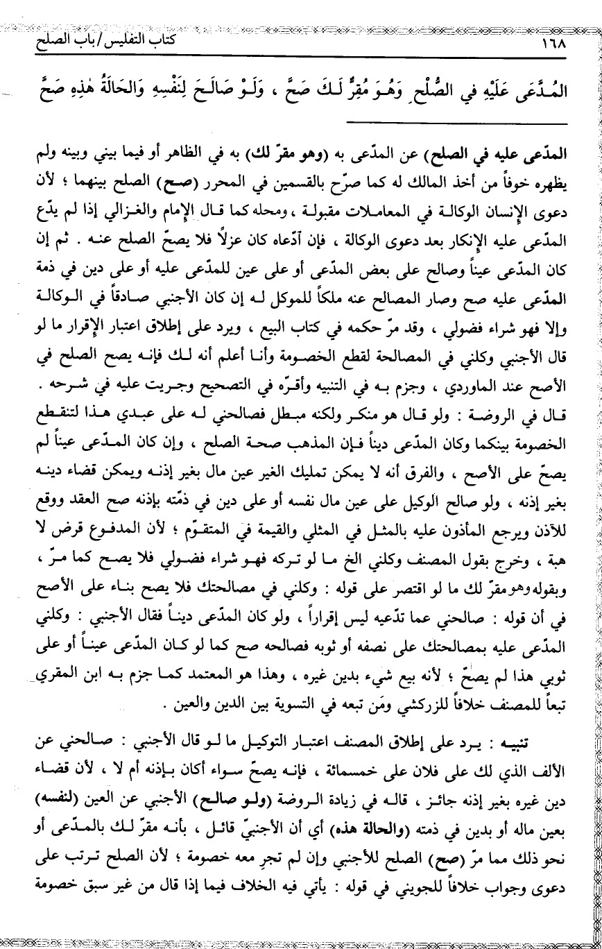 ـــــــــــــــــــــــــــــQالْمُدَّعَى عَلَيْهِ فِي الصُّلْحِ) عَنْ الْمُدَّعَى بِهِ (وَهُوَ مُقِرٌّ لَك) بِهِ فِي الظَّاهِرِ أَوْ فِيمَا بَيْنِي وَبَيْنَهُ وَلَمْ يُظْهِرْهُ خَوْفًا مِنْ أَخْذِ الْمَالِكِ لَهُ كَمَا صَرَّحَ بِالْقِسْمَيْنِ فِي الْمُحَرَّرِ (صَحَّ) الصُّلْحُ بَيْنَهُمَا؛ لِأَنَّ دَعْوَى الْإِنْسَانِ الْوَكَالَةَ فِي الْمُعَامَلَاتِ مَقْبُولَةٌ، وَمَحَلُّهُ كَمَا قَالَ الْإِمَامُ وَالْغَزَالِيُّ إذَا لَمْ يَدَّعِ الْمُدَّعَى عَلَيْهِ الْإِنْكَارَ بَعْدَ دَعْوَى الْوَكَالَةِ، فَإِنْ ادَّعَاهُ كَانَ عَزْلًا فَلَا يَصِحُّ الصُّلْحُ عَنْهُ. ثُمَّ إنْ كَانَ الْمُدَّعَى عَيْنًا وَصَالَحَ عَلَى بَعْضِ الْمُدَّعَى أَوْ عَلَى عَيْنٍ لِلْمُدَّعَى عَلَيْهِ أَوْ عَلَى دَيْنٍ فِي ذِمَّةِ الْمُدَّعَى عَلَيْهِ صَحَّ وَصَارَ الْمُصَالَحُ عَنْهُ مِلْكًا لِلْمُوَكِّلِ لَهُ إنْ كَانَ الْأَجْنَبِيُّ صَادِقًا فِي الْوَكَالَةِ وَإِلَّا فَهُوَ شِرَاءُ فُضُولِيٍّ، وَقَدْ مَرَّ حُكْمُهُ فِي كِتَابِ الْبَيْعِ، وَيُرَدُّ عَلَى إطْلَاقِ اعْتِبَارِ الْإِقْرَارِ مَا لَوْ قَالَ الْأَجْنَبِيُّ وَكِّلْنِي فِي الْمُصَالَحَةِ لِقَطْعِ الْخُصُومَةِ وَأَنَا أَعْلَمُ أَنَّهُ لَك، فَإِنَّهُ يَصِحُّ الصُّلْحُ فِي الْأَصَحِّ عِنْدَ الْمَاوَرْدِيُّ، وَجَزَمَ بِهِ فِي التَّنْبِيهِ وَأَقَرَّهُ فِي التَّصْحِيحِ وَجَرَيْت عَلَيْهِ فِي شَرْحِهِ. قَالَ فِي الرَّوْضَةِ: وَلَوْ قَالَ هُوَ مُنْكَرٌ وَلَكِنَّهُ مُبْطِلٌ فَصَالِحْنِي لَهُ عَلَى عَبْدِي هَذَا لِتَنْقَطِعَ الْخُصُومَةُ بَيْنَكُمَا وَكَانَ الْمُدَّعَى دَيْنًا فَإِنَّ الْمَذْهَبَ صِحَّةُ الصُّلْحِ، وَإِنْ كَانَ الْمُدَّعَى عَيْنًا لَمْ يَصِحَّ عَلَى الْأَصَحِّ، وَالْفَرْقُ أَنَّهُ لَا يُمْكِنُ تَمْلِيكُ الْغَيْرِ عَيْنَ مَالٍ بِغَيْرِ إذْنِهِ وَيُمْكِنُ قَضَاءُ دَيْنِهِ بِغَيْرِ إذْنِهِ.