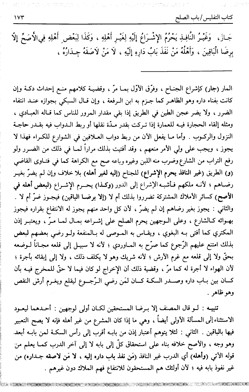 تَنْبِيهٌ: قَالَ الْمُصَنِّفُ إلَّا بِرِضَا الْمُسْتَحَقِّينَ لَكَانَ أَوْلَى لِوَجْهَيْنِ: أَحَدُهُمَا لِيَعُودَ الِاسْتِثْنَاءُ إلَى الْمَسْأَلَةِ الْأُولَى أَيْضًا، وَهِيَ مَا إذَا كَانَ الْمُشَرِّعُ مِنْ غَيْرِ أَهْلِهِ فَإِنَّهُ لَا يَصِحُّ التَّعْبِيرُ فِيهَا بِالْبَاقِينَ. الثَّانِي: لِئَلَّا يُتَوَهَّمَ اعْتِبَارُ إذْنِ مَنْ بَابُهُ أَقْرَبُ إلَى رَأْسِ السِّكَّةِ لِمَنْ بَابُهُ أَبْعَدُ وَهُوَ وَجْهٌ، وَالْأَصَحُّ خِلَافُهُ بِنَاءً عَلَى اسْتِحْقَاقِ كُلٍّ إلَى بَابِهِ لَا إلَى آخِرِ الدَّرْبِ يُعْلَمُ مِنْ قَوْلِهِ الْآتِي (وَأَهْلُهُ) أَيْ الدَّرْبِ غَيْرِ النَّافِذِ (مَنْ نَفَذَ بَابُ دَارِهِ إلَيْهِ، لَا مَنْ لَاصَقَهُ جِدَارُهُ) مِنْ غَيْرِ نُفُوذِ بَابِهِ فِيهِ؛ لِأَنَّ أُولَئِكَ هُمْ الْمُسْتَحِقُّونَ لِلِانْتِفَاعِ فَهُمْ الْمُلَّاكُ دُونَ غَيْرِهِمْ.